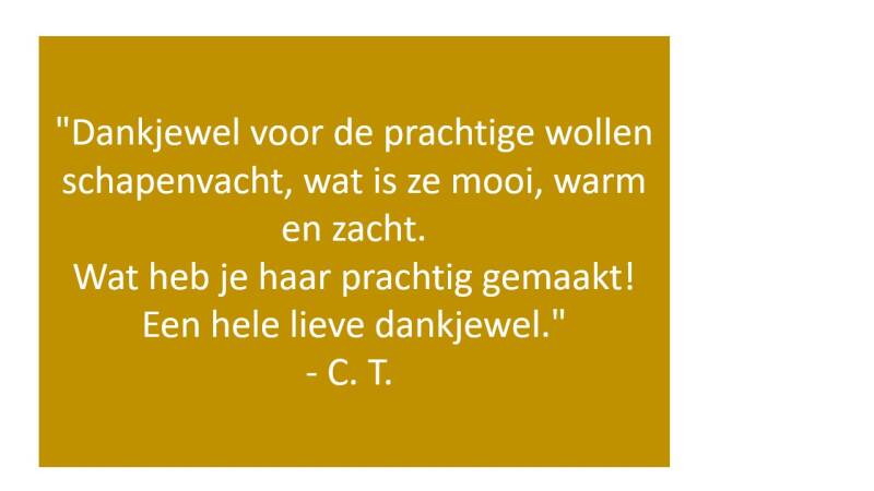 Lieve Suzie, wat maak jij werkelijk prachtige vachten. Inmiddels heb ik er 3 in mijn bezit en voor mijn moeder er net 2 besteld. Het zijn mooie natuurproducten en diervriendelijk. Ik vind de vachten met de lange haren het mooist en ik wil in het nieuwe jaar zo'n grote bij jou bestellen voor over mijn eetbank. Weet nu al dat prachtig gaat staan. Dank je wel voor je mooie handwerk en 100% diervriendelijk!!!
