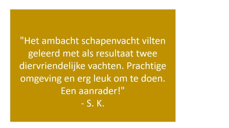 Wat een mooie viltvacht heb je gemaakt van de wol van een Drents schaap. En geen schapengeur. Ben er heel blij mee. Marijke