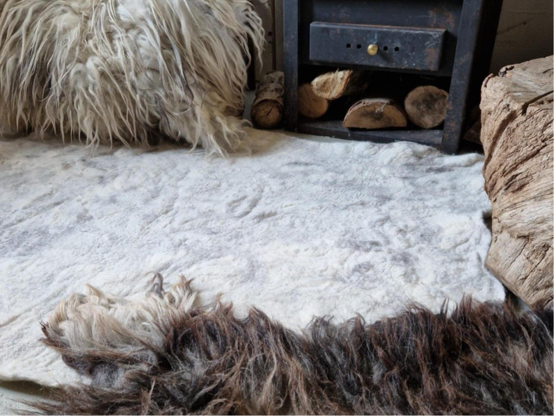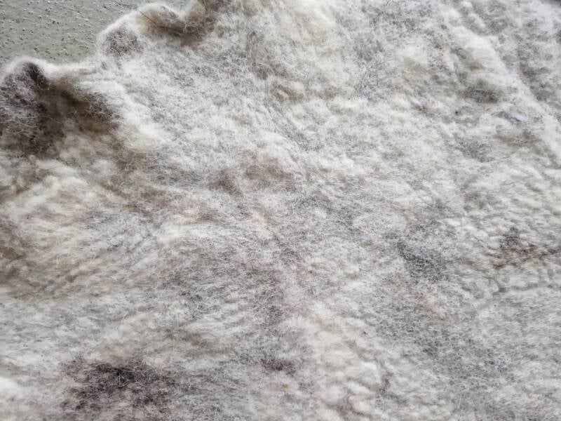 Kleed van wolvilt. Vrij dik en stevig gevilt. Wit met lichtgrijs, de andere kant is wit. Het kleed is een beetje shabby door de golvende randen. Lekker zacht aan je (blote) voeten en warm.