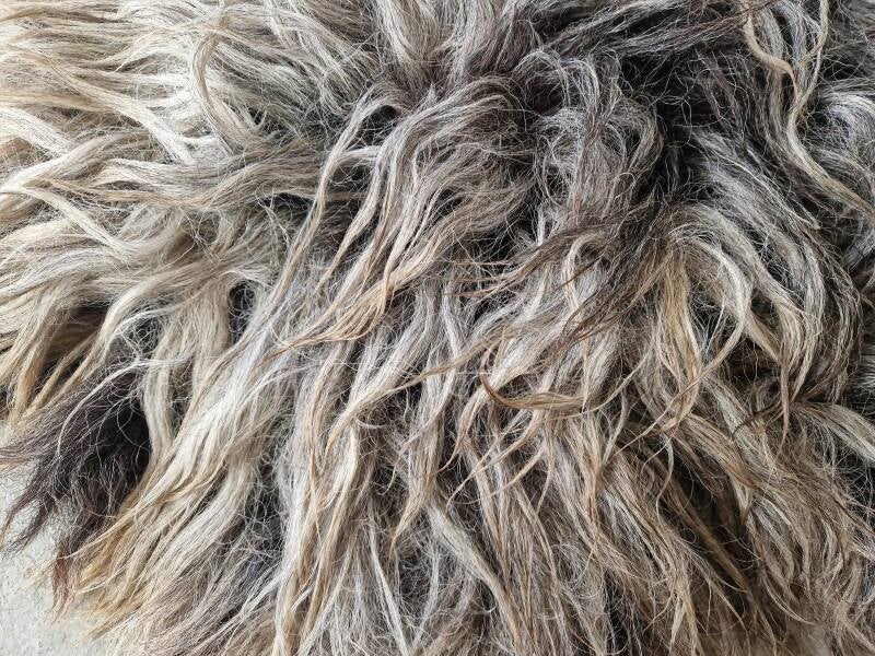 Grijs vachtje met wat nuances in beige. Het hart is zo donker dat het bijna zwart is. Lange haren, vrij ruw. Het vachtje verhaart nog wat (kenmerkend voor wol van dit ras) en is daardoor minder geschikt voor intensief gebruik maar meer ter decoratie.