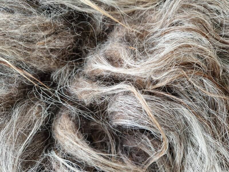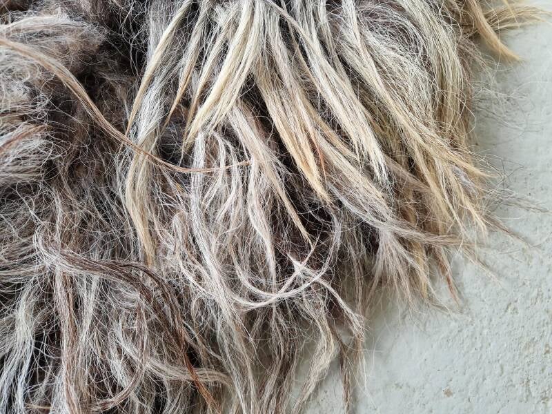 Grijs vachtje met nuances in blond, taupe, wat bruin... De lokken zijn lang en wat ruig, niet glad. Is meestal bij dit ras. Ook verhaart het vachtje nog, waardoor het minder geschikt is voor intensief gebruik maar echt meer is ter decoratie. Vachtje #490 is gemaakt van wol van hetzelfde schaap.
