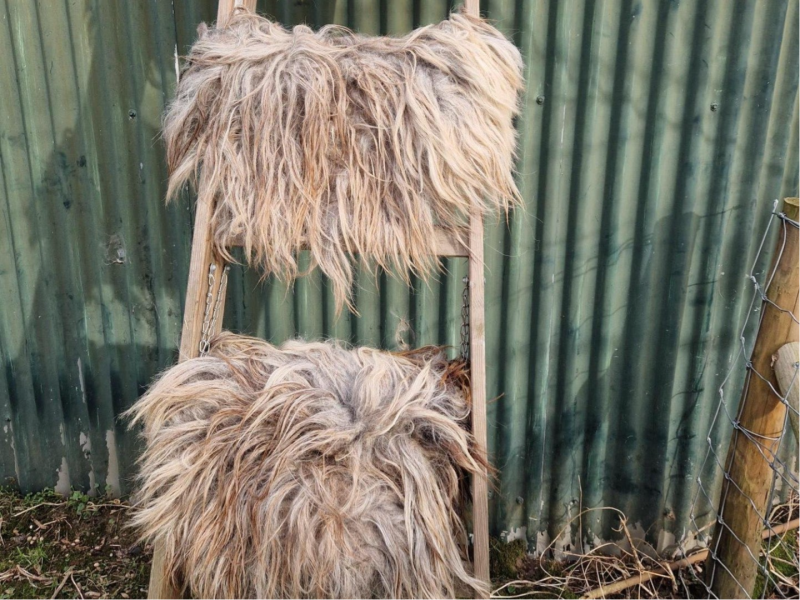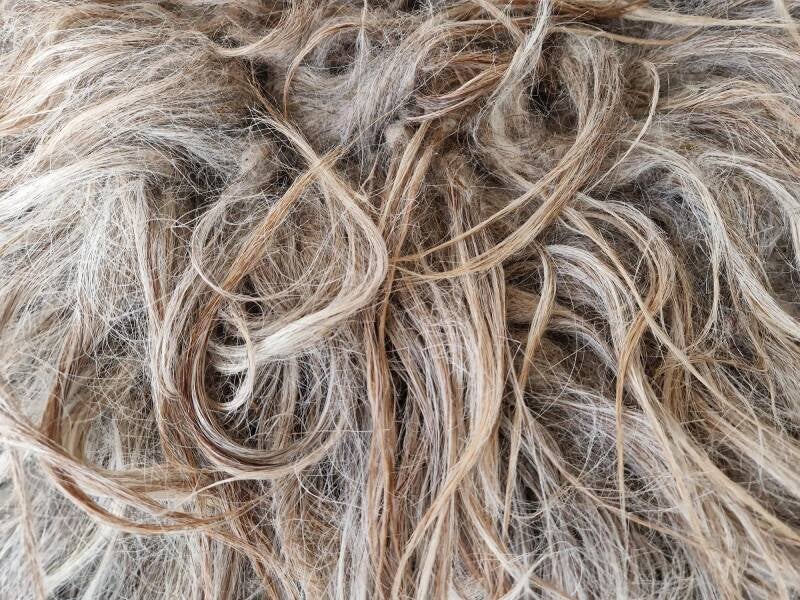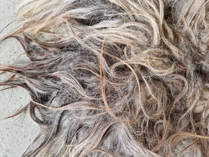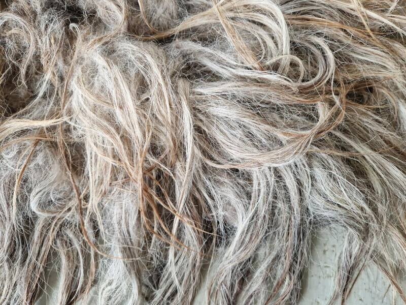 Heel dik vachtje met ruige, niet gladde, lange lokken. Grijs maar ook heel veel taupe/beige achtig en een paar donkerbruine haren ertussen. Heel warm van kleur. Dit ras staat erom bekend dat het nog haart, daarom is het vachtje voornamelijk ter decoratie. Vachtje #489 is gemaakt van wol van hetzelfde schaap.