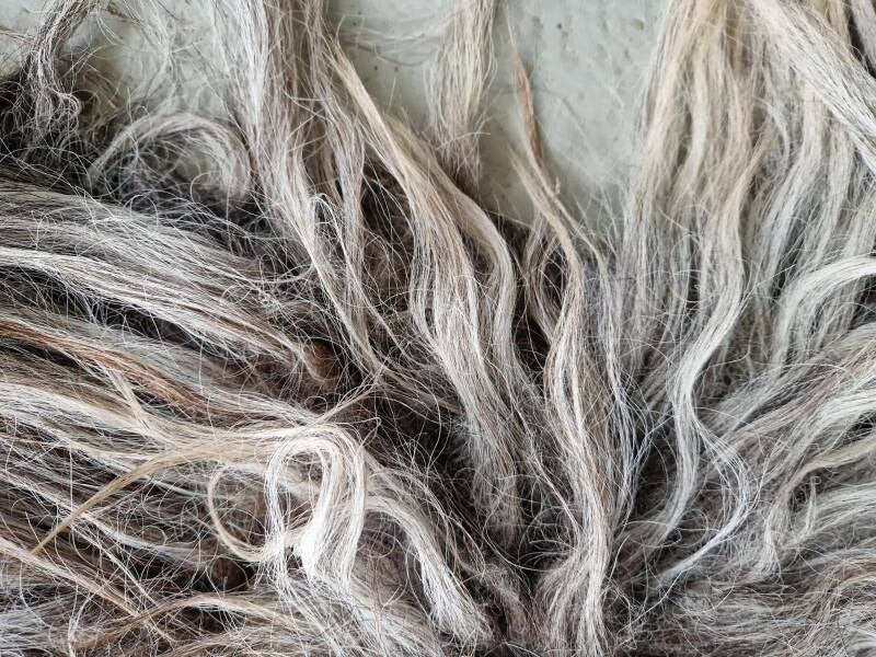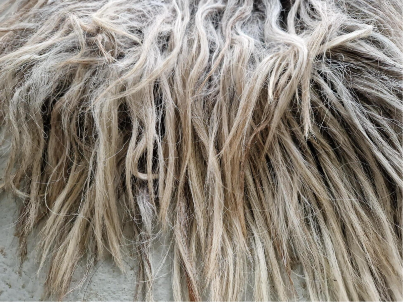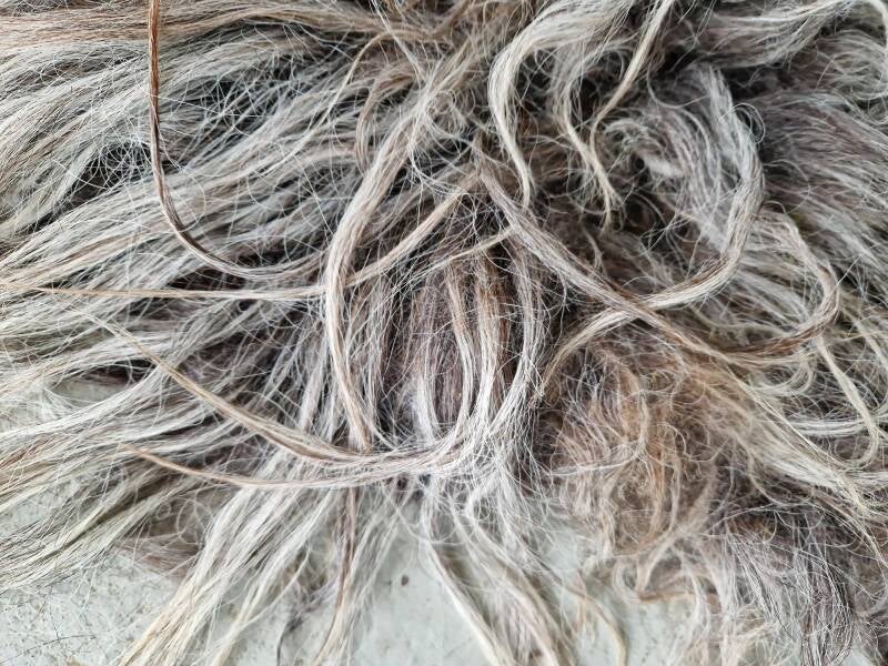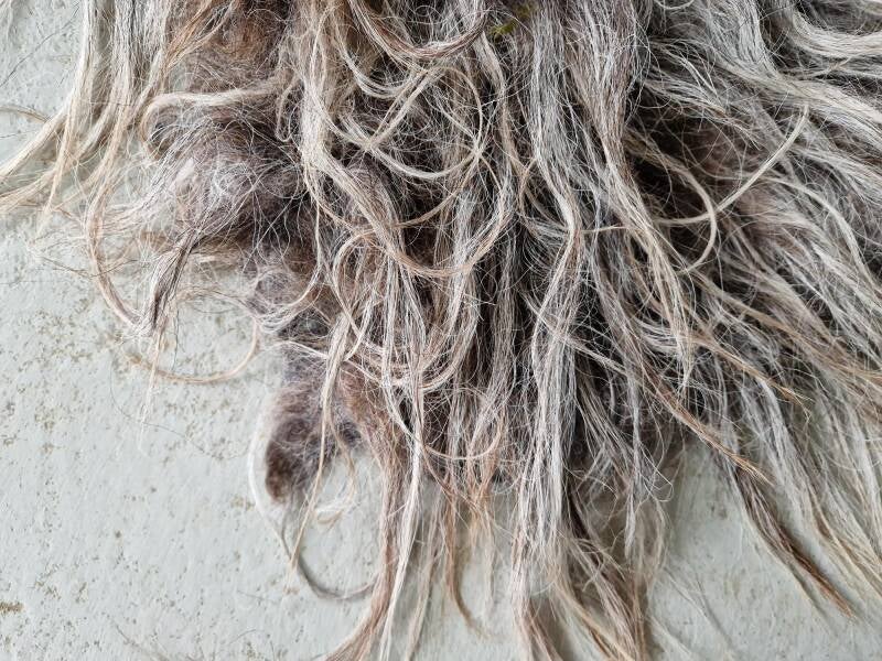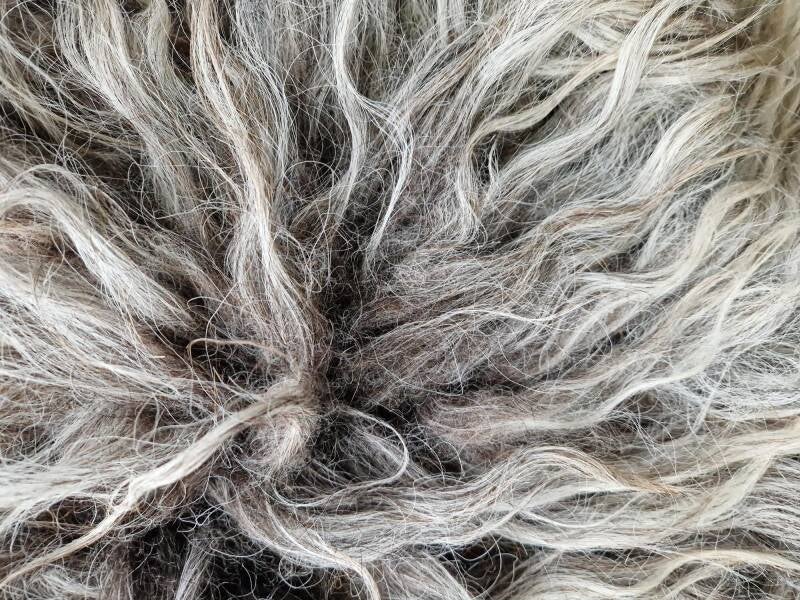 Grijs vachtje met nuances in blond, taupe, wat bruin... De lokken zijn lang en wat ruig, niet glad. Is meestal bij dit ras. Ook verhaart het vachtje nog, waardoor het minder geschikt is voor intensief gebruik maar echt meer is ter decoratie. Vachtje #487 is gemaakt van wol van hetzelfde schaap.