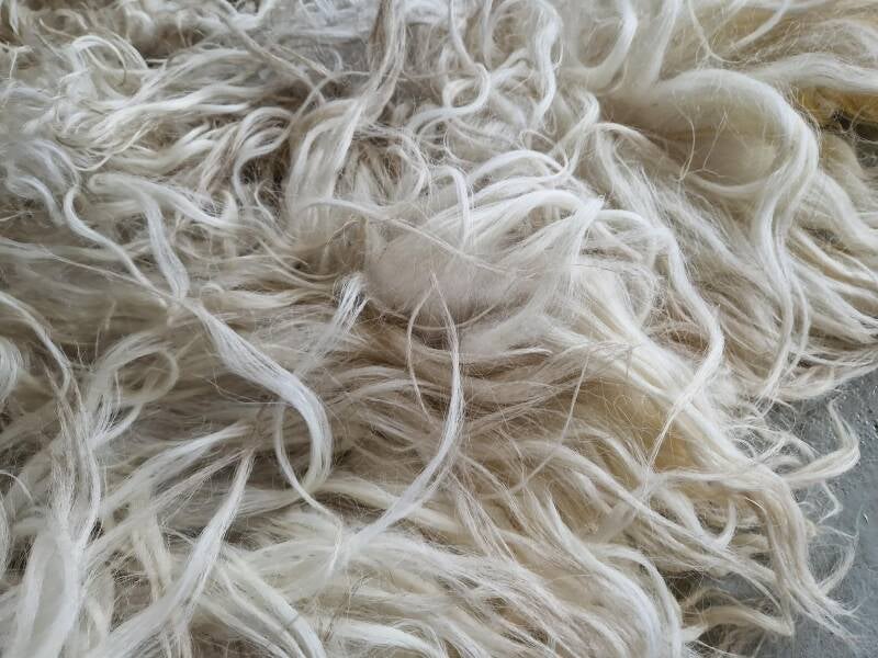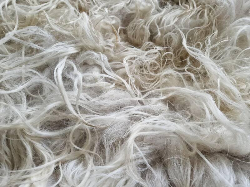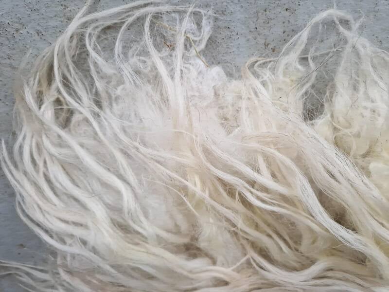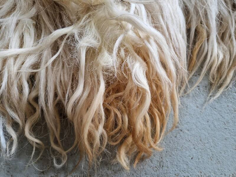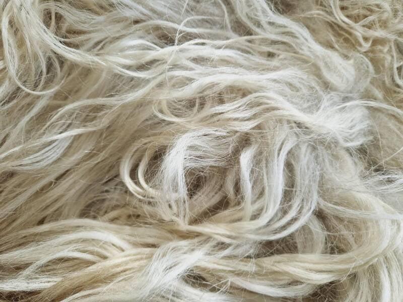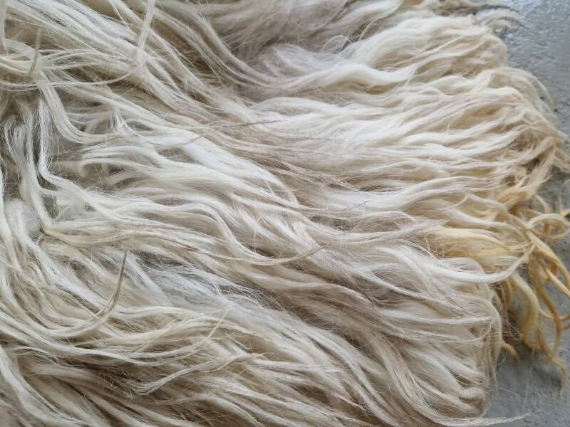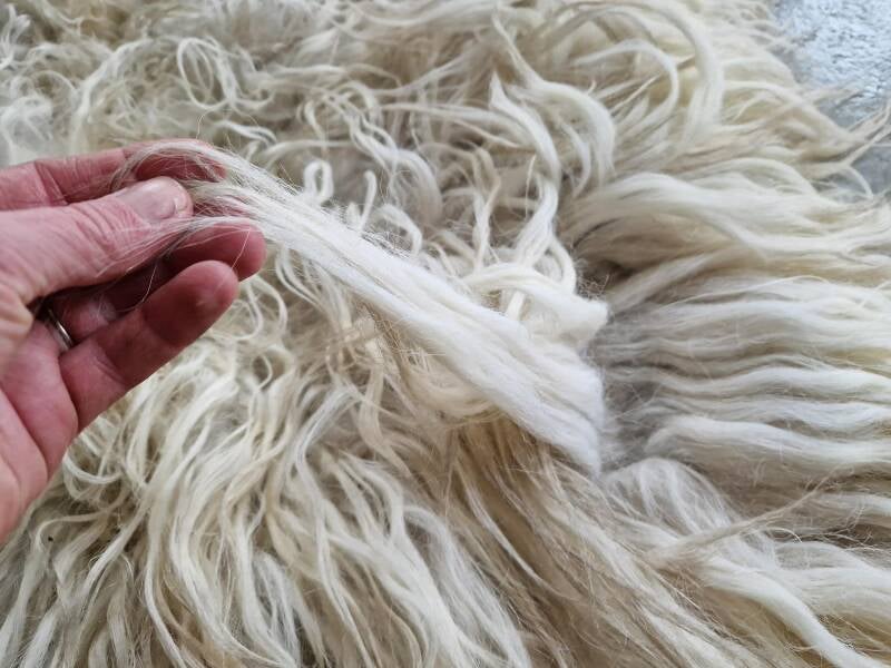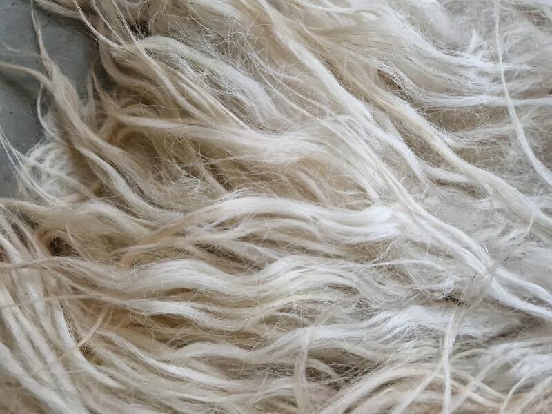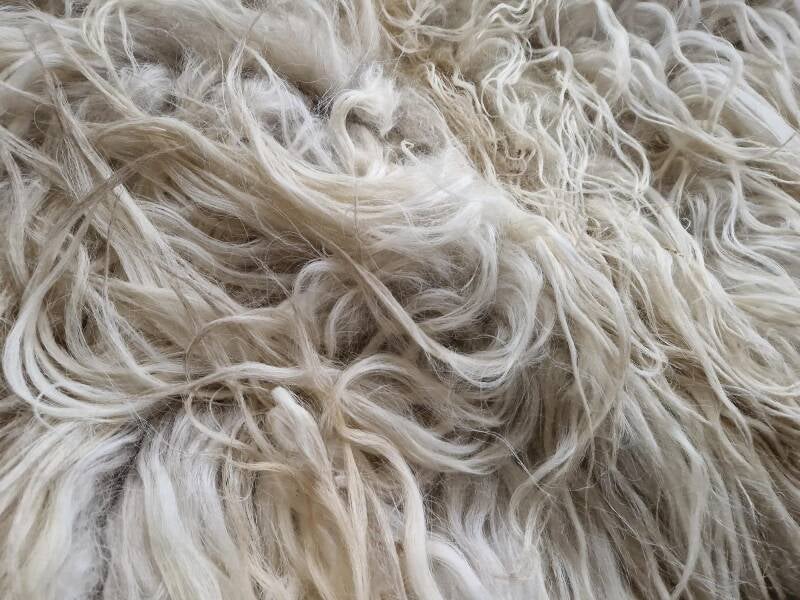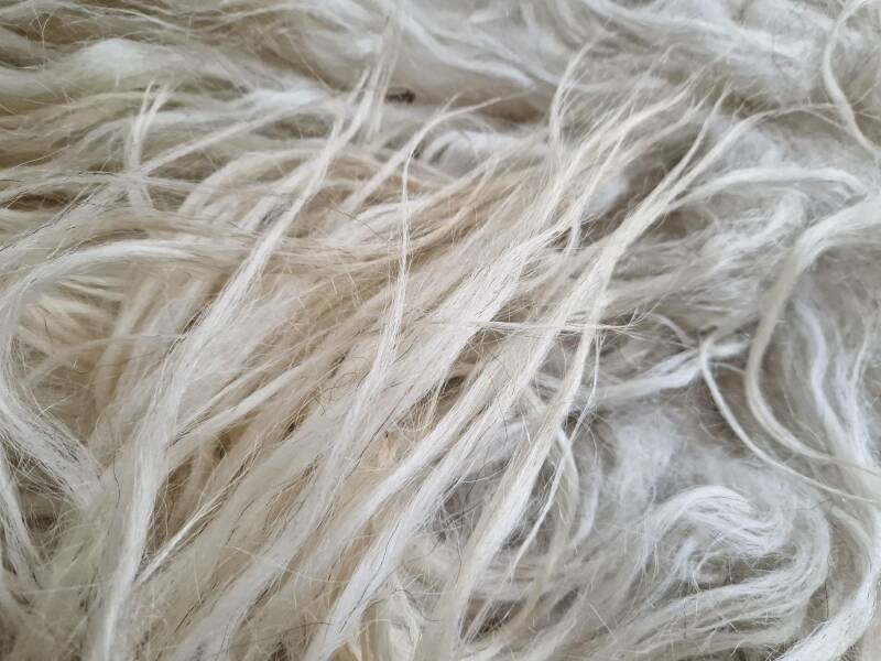 Een pronkstuk, wat een weelderige, volle, lange lokken, overal! Helder wit, iets warmer en aan de achterpoten een klein stukje donkerder (zie foto). Er zit een heel licht grijzige basis aan sommige lokken en een enkele grijze haar her en der, wat nog meer volume en levendigheid geeft. Hij haart nog wat, maar wat een vacht, zo zie ik ze niet vaak.