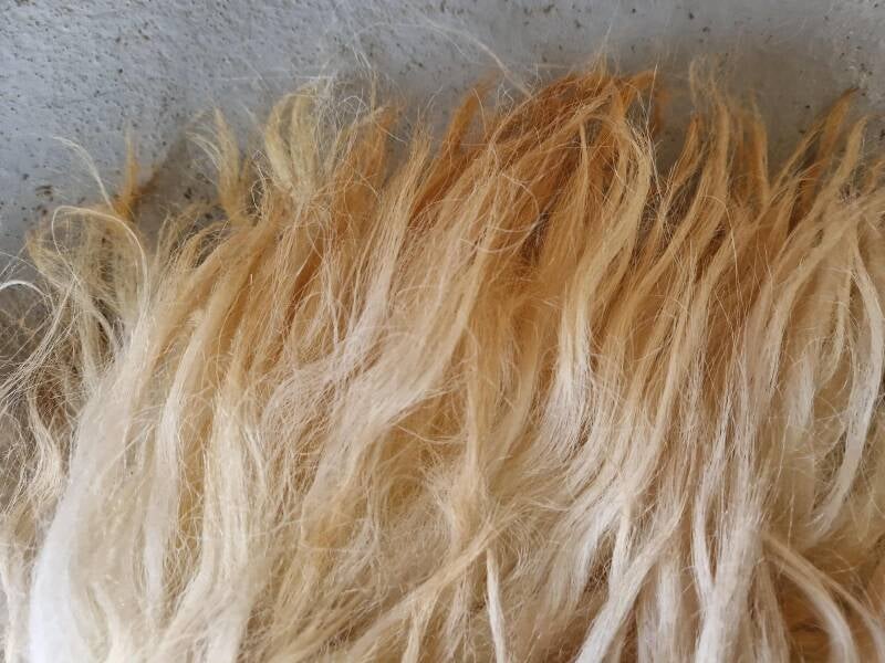 Dikke, volle vacht met weelderige, lange lokken. Wolwit, warm wit, gelig wit, allerlei nuances wit. Wel duidelijk ook gelig wit (zie foto), dat is de natuurlijke kleur. Echt een natuurvacht, haart nog iets, met prachtige diepte en lokken.