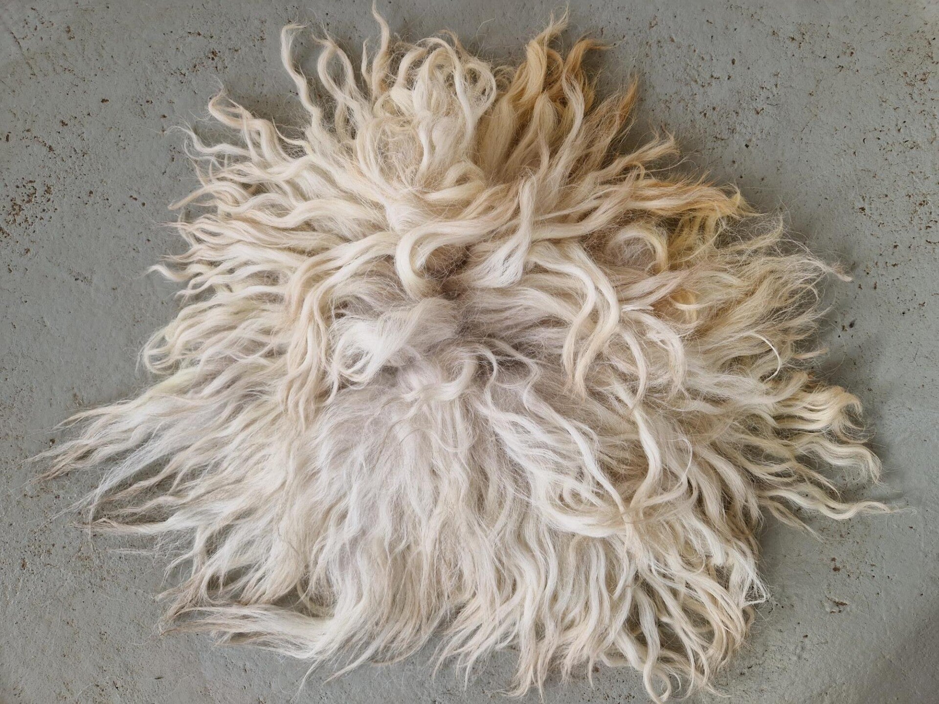Licht van kleur met een wat grijzige basis. Enkele lokken lopen wat uit naar wat donkerder/warmer, zie foto's. De lokken zijn erg lang en een beetje ruw, niet glad. Het vachtje kan nog wat verharen maar is wel mooi vol.