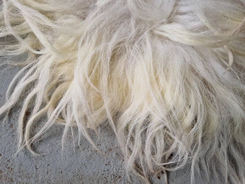 Licht van kleur met een wat grijzige basis. Enkele lokken neigen naar gelig, zie foto's. De lokken zijn erg lang en een beetje ruw, niet glad. Het vachtje kan nog wat verharen maar is wel mooi vol. Op het bankje is het het rechter vachtje.