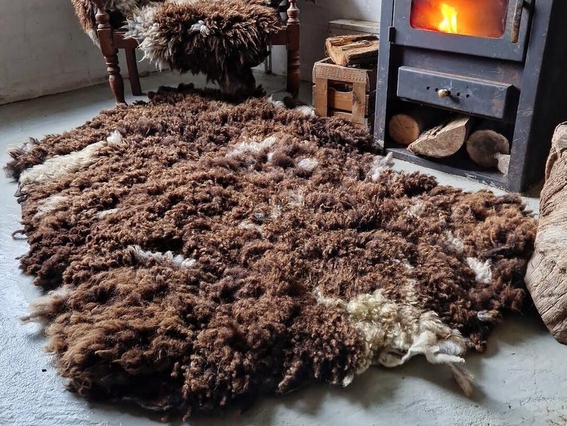 Grote, dikke, zware vacht. Super zacht. De lokken hebben een zwarte basis, de punten zijn bruin. Ook delen wolwit, ietwat grauwig wit. Het dekstempel is er bijna helemaal uit gewassen, maar als je goed kijkt zie je op één witte vlek een heel licht gele zweem. Af en toe een hooitje, maar absoluut niet storend. Sommige plekken zijn wat pluiziger, daar komt de onderwol meer naar boven. Te zien op de foto's. De randen zijn niet allemaal helemaal 'zoals het hoort'. De vacht was zo groot en dik dat hij bijna onhandelbaar was. Dus her en der wat rafelige randjes.