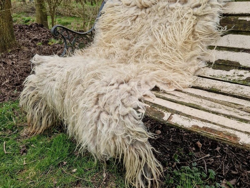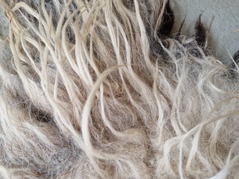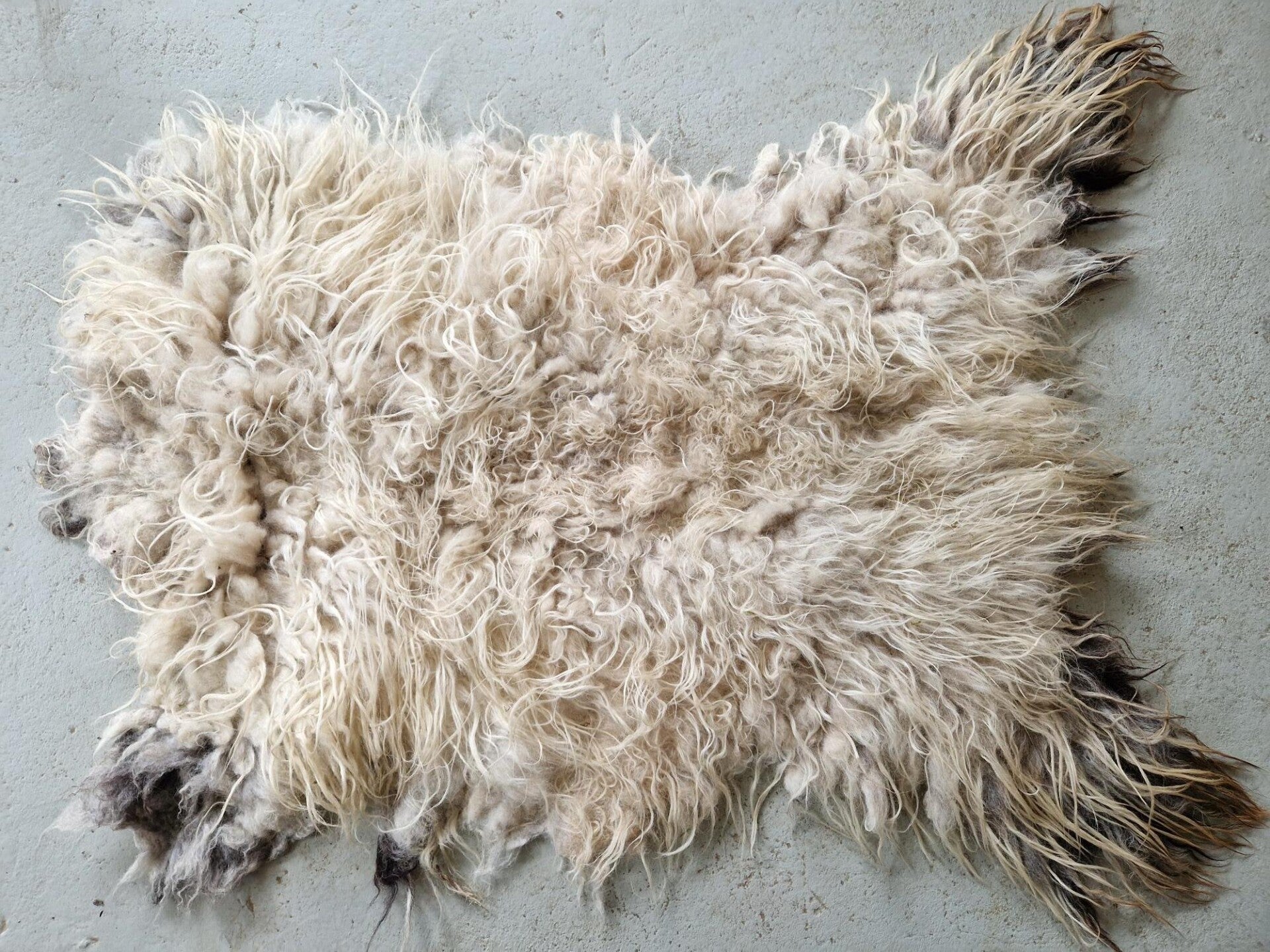 Soepel vallend vachtje is wat grauwig wit. Duidelijk ook wat grijzig in de basis en bij de voor- en achterpoten donkerbruin/zwart. Het nekstuk is wat natuurlijk vervilt, voor de extra 'shabby' look.