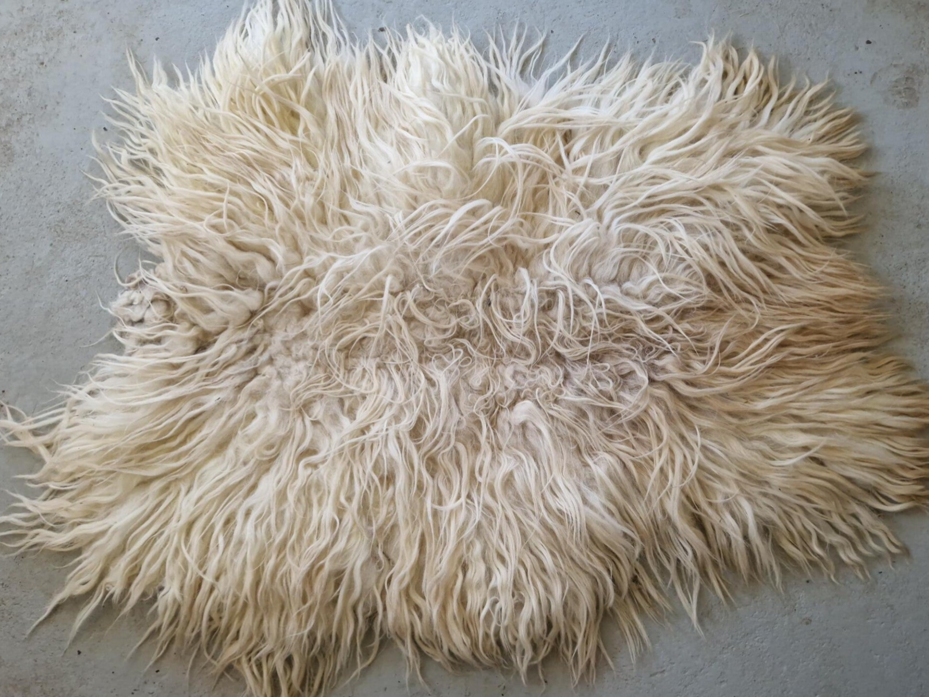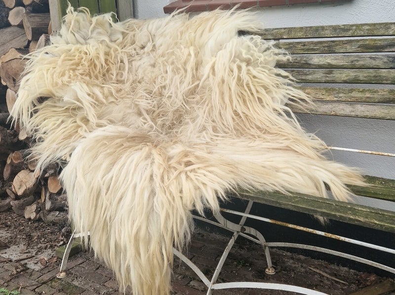 Volle vacht met lange, weelderige lokken. Wit met gelig wit op sommige plekken bij de voorpoten. De achterpoten en onderrug hebben juist iets warmer witte tinten, sommige neigend naar wat roestbruin, heel licht. Het nekstuk zit er nog een klein beetje aan, hierin zit ook ietsje bruin (zie laatste foto).