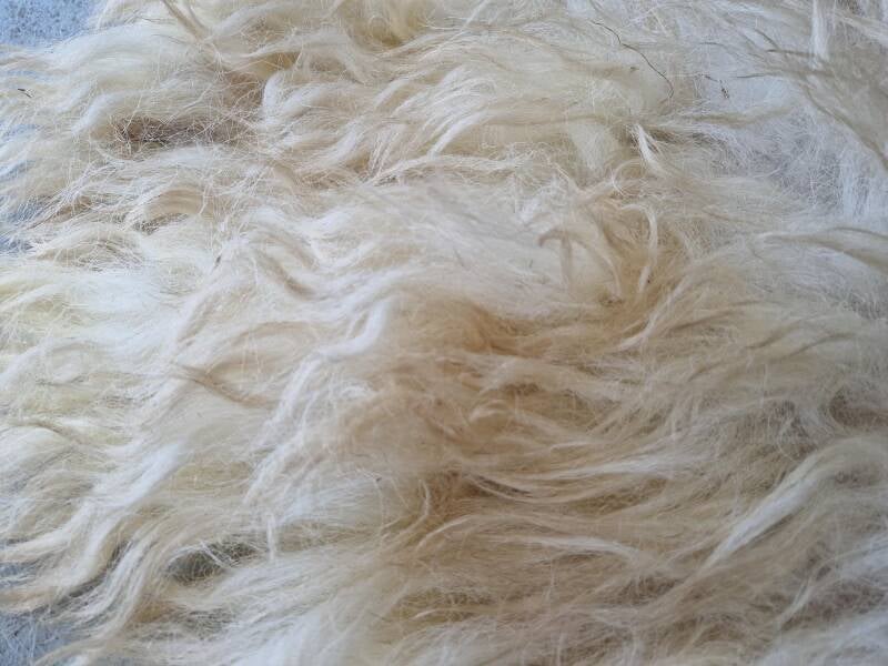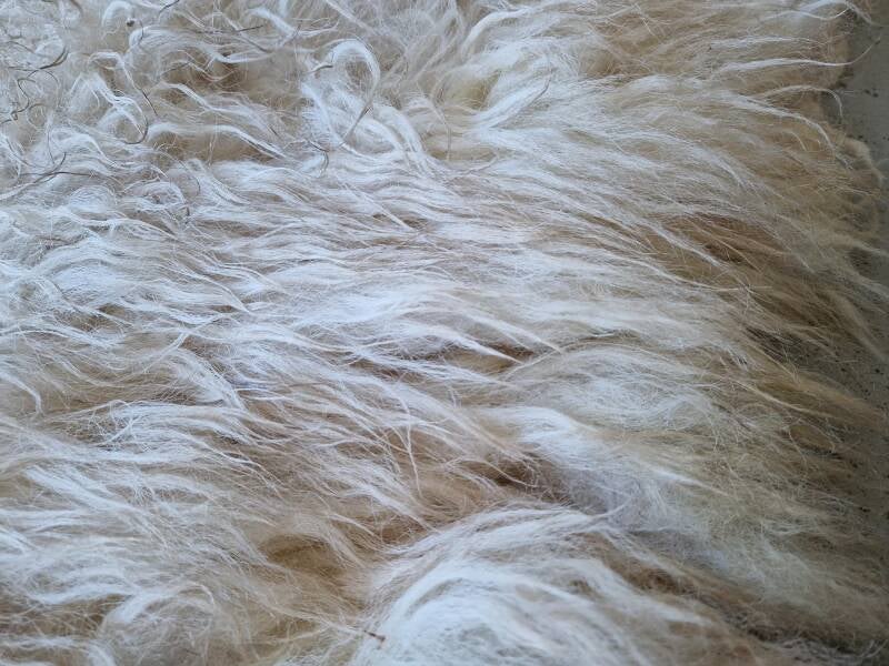Vrij dikke vacht maar toch soepel. Halflange tot lange lokken in wit, wat gelig wit aan de randen. De haren op de rug zijn wat dunner, op de achterpoten zijn dikker.