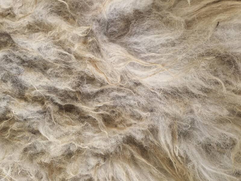Stevige, zware, grote vacht. wolwit, geelwit, vossig, bruin en grijs. Het rugstuk was ontzettend dun, maar omdat ik dit soort vachten ook een kans wil geven ben ik er toch aan begonnen. Het rugstuk is extra verstevigd en plat. De verdere lokken zijn lang en dik. Niet glad, typisch voor Schoonebeeker. Voor iemand die van iets anders dan 'perfect mooi' houdt.