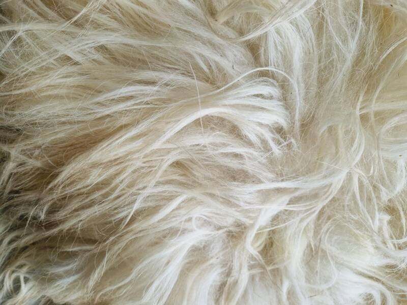 Vol vachtje met lange, dikke lokken. Wolwit en geel wit, misschien nog een tikje geler dan op de foto's lijkt. Daardoor wel heel warm aandoend. Vachtje #536 is gemaakt van wol van hetzelfde schaap. Op de laatste foto is het het vachtje dat op de zitting van de bank ligt.