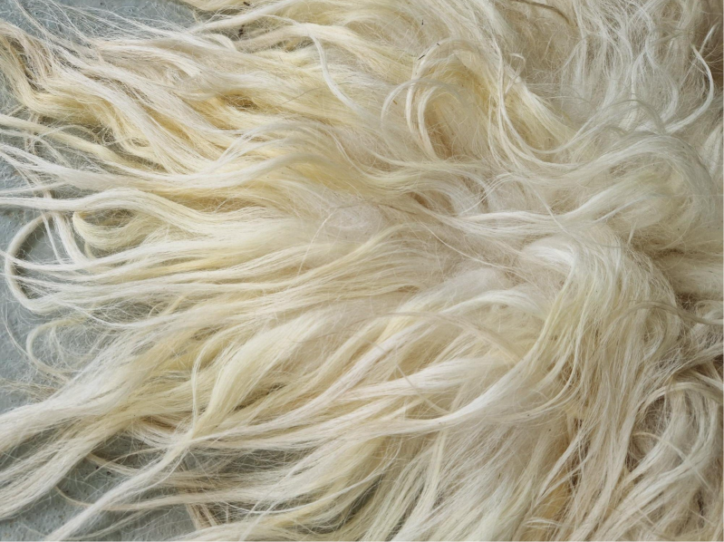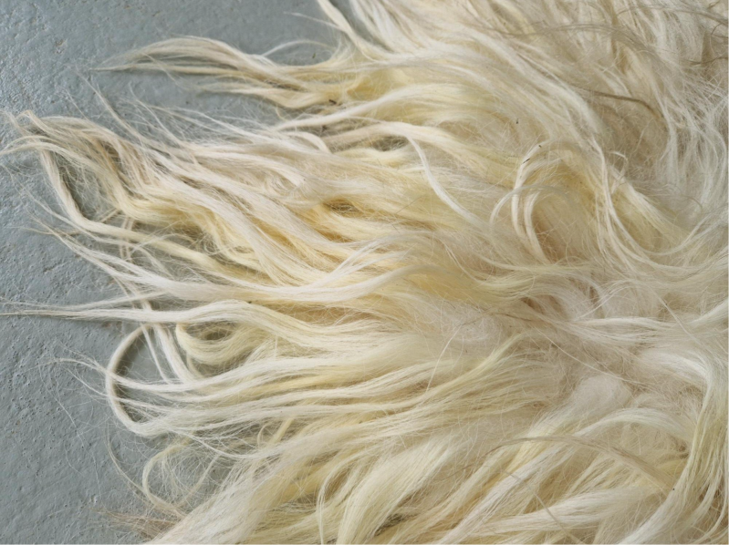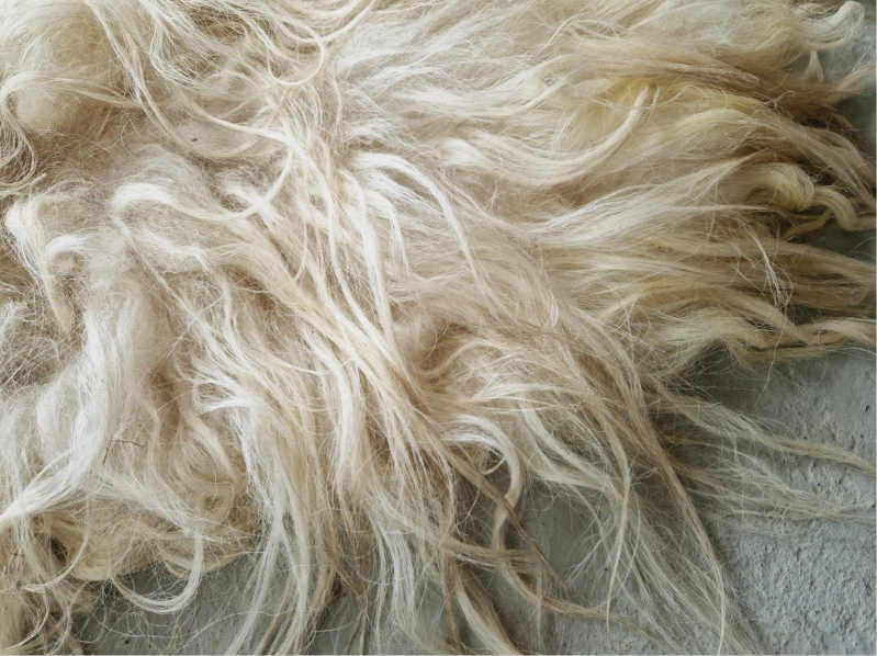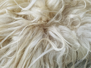 Vol vachtje met lange, dikke lokken. Wolwit en geel wit, misschien nog een tikje geler dan op de foto's lijkt. Daardoor wel heel warm aandoend. Er zit een heel klein tikje wat vossigs in.
