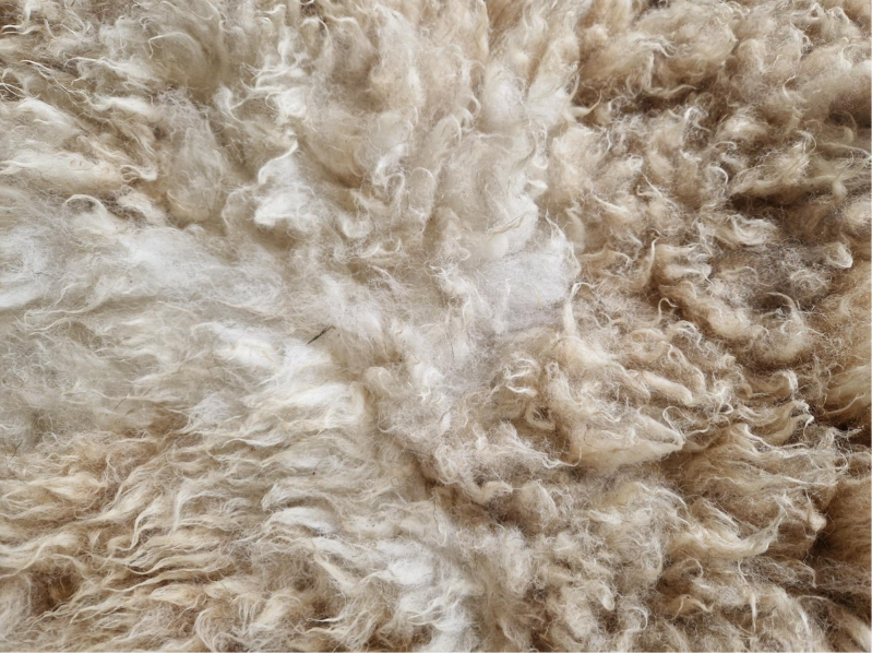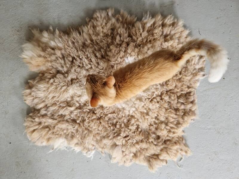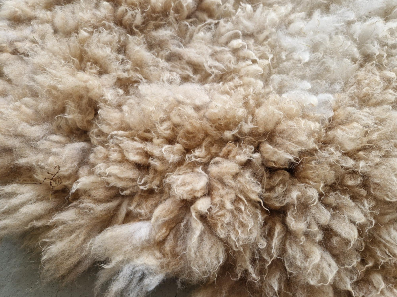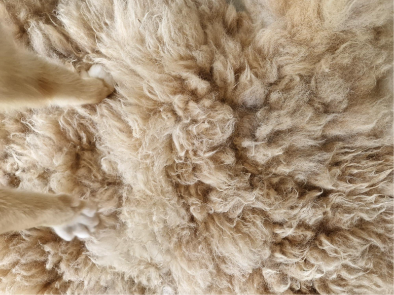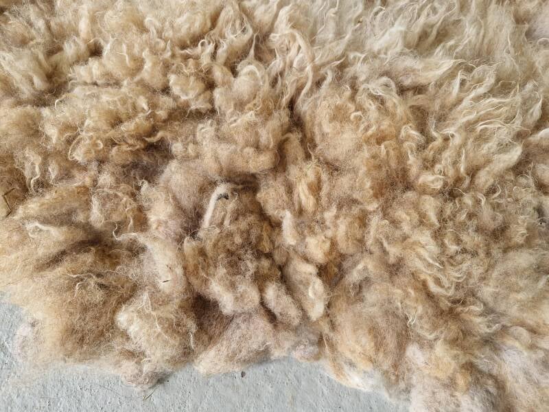 Super zacht vachtje. Korte lokken. Beige, vos, lichtbruin en wit.