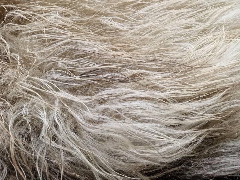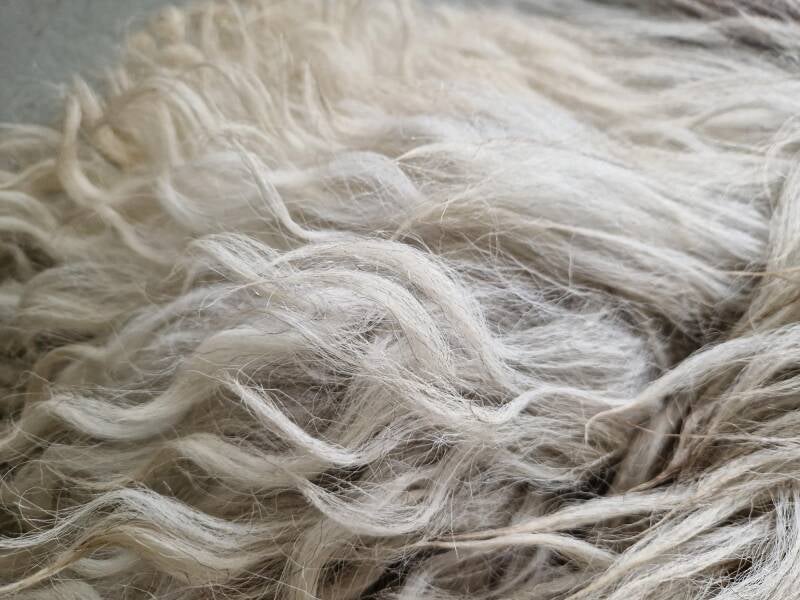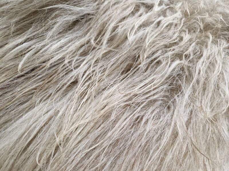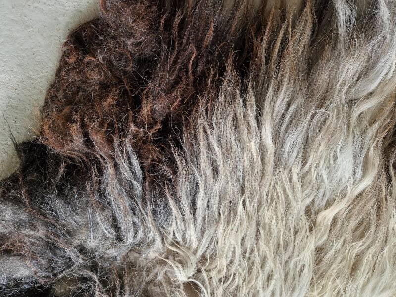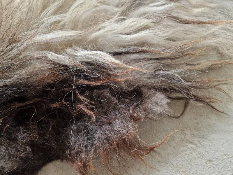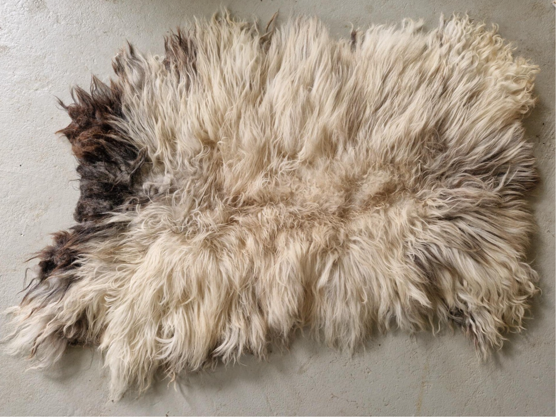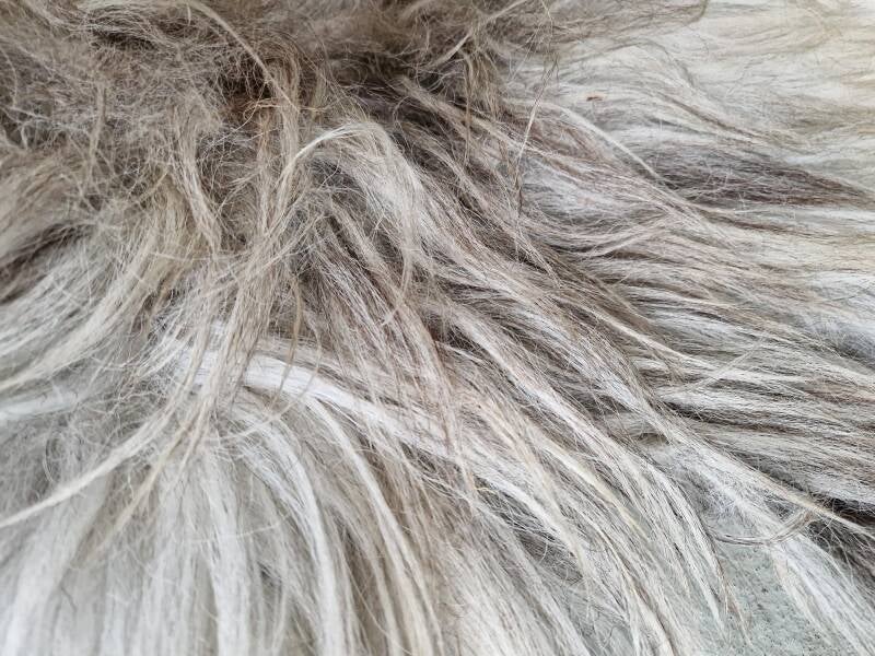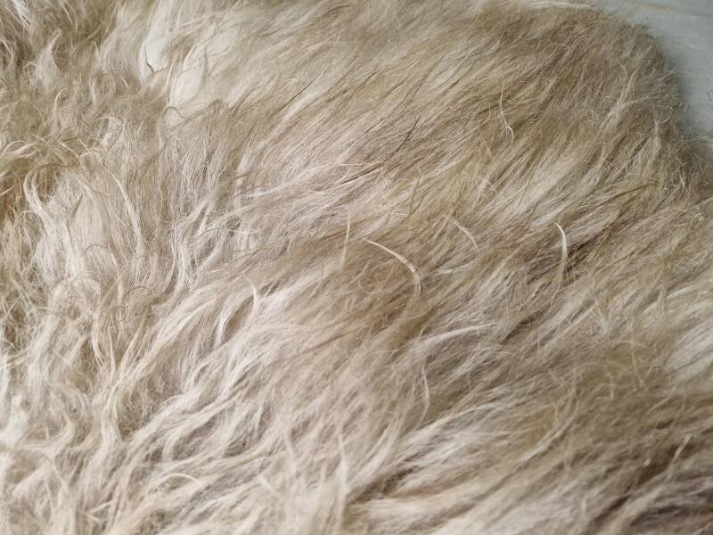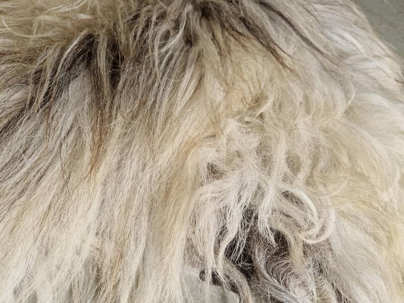 Grote vacht met lange lokken. Her en der grof, maar over het algemeen behoorlijk fijn, terwijl het toch een Schoonebeeker is. Wolwit, soms wat helderder wit, grijs, bruin, zwart. Het nekstuk is al wat natuurlijk vervilt en wat harig.