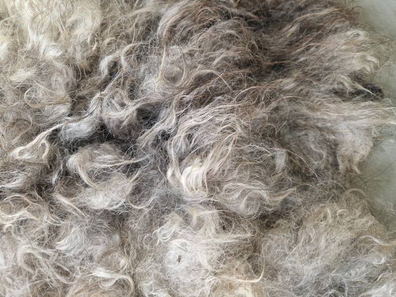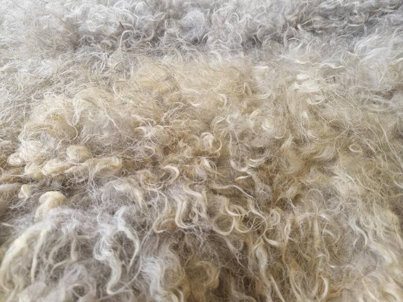 Erg zachte, vrij soepele vacht, eerste schering, van een Gotland jaarling. Het grijs zit er al duidelijk in (Gotland schapen zijn grijs), maar ook de lamskleuren (wat geel-wit) zijn duidelijk overheersend. De krulletjes zijn lekker zacht.