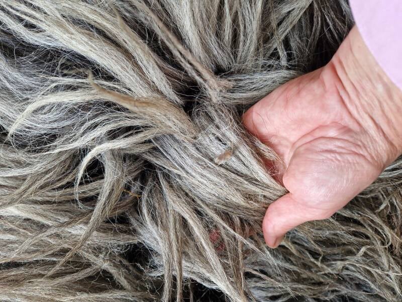 Vacht met ruigere lokken (niet glad) in taupe, zwart, grijs, bruin, beige. De lokken zijn erg lang en vol over de gehele vacht.