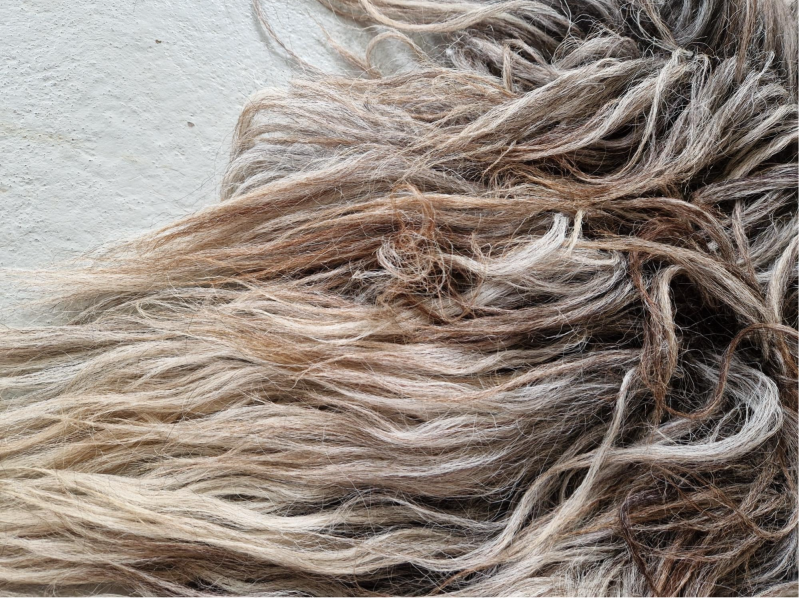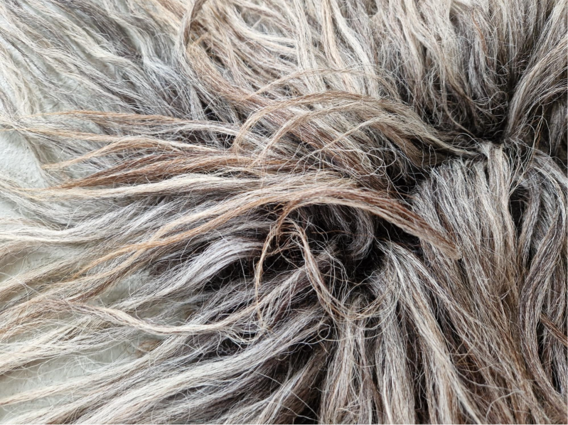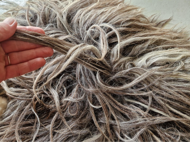 Dik, vol vachtje in grijs met bruin en taupe. Lange lokken. Vachtje #563 is gemaakt van wol van hetzelfde schaap.