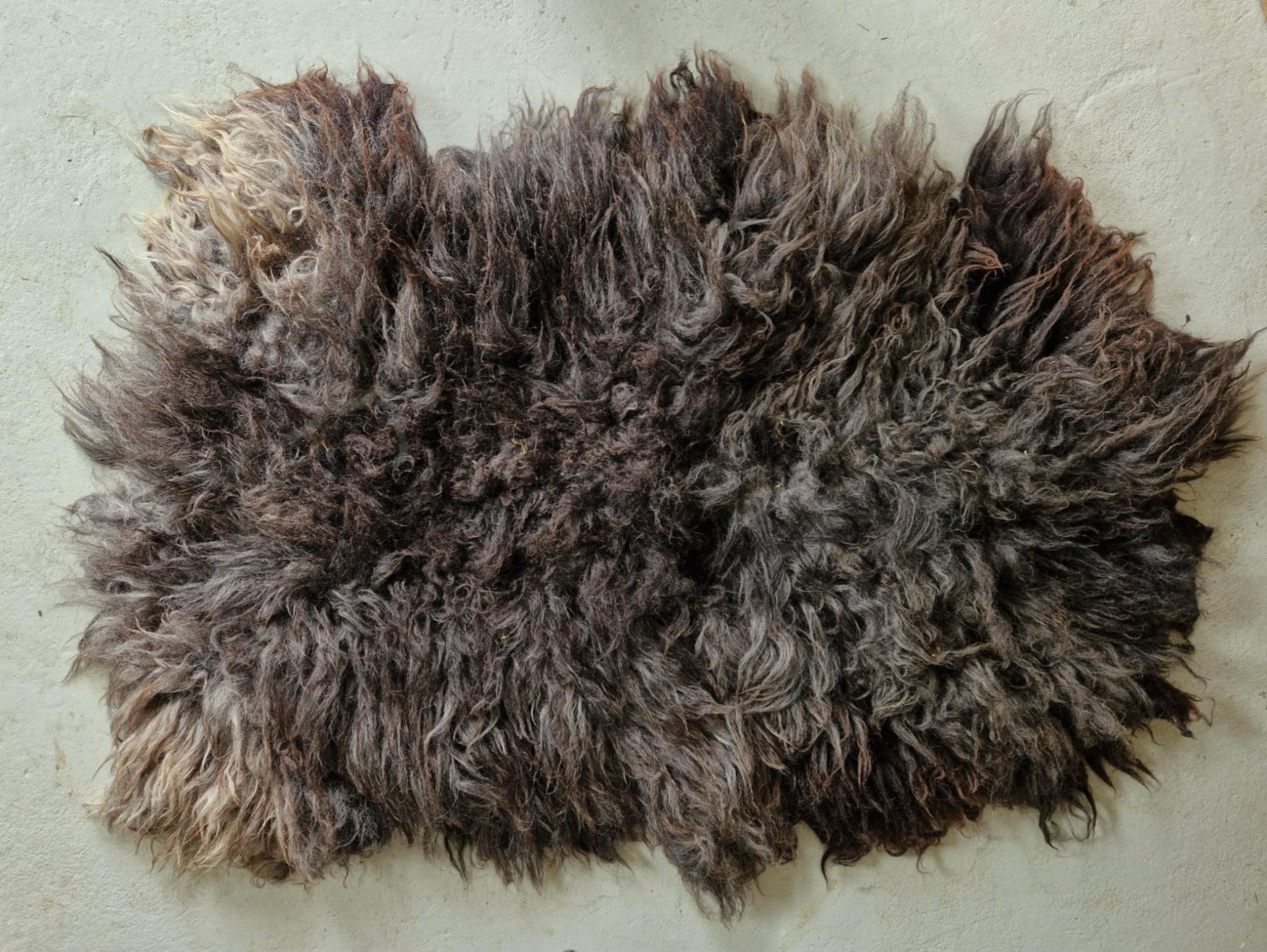 Erg donkere, grote vacht. Ruige lokken, halflang, niet glad, goed op de foto's te zien. Zwart en heel donker grijs en donker bruin. Bij de dijbenen ietsje lichter.