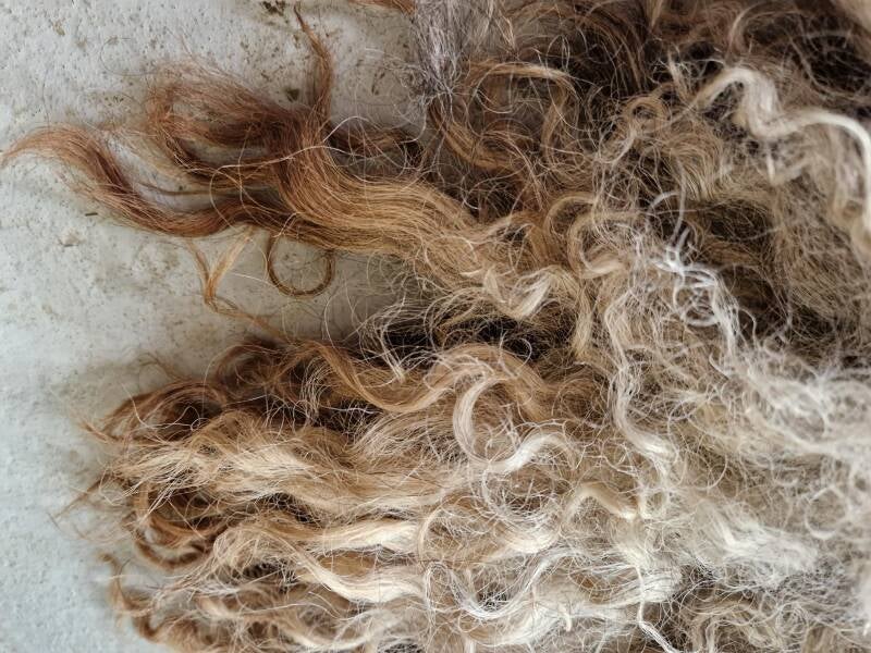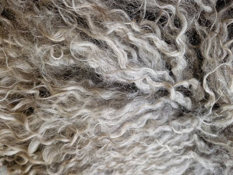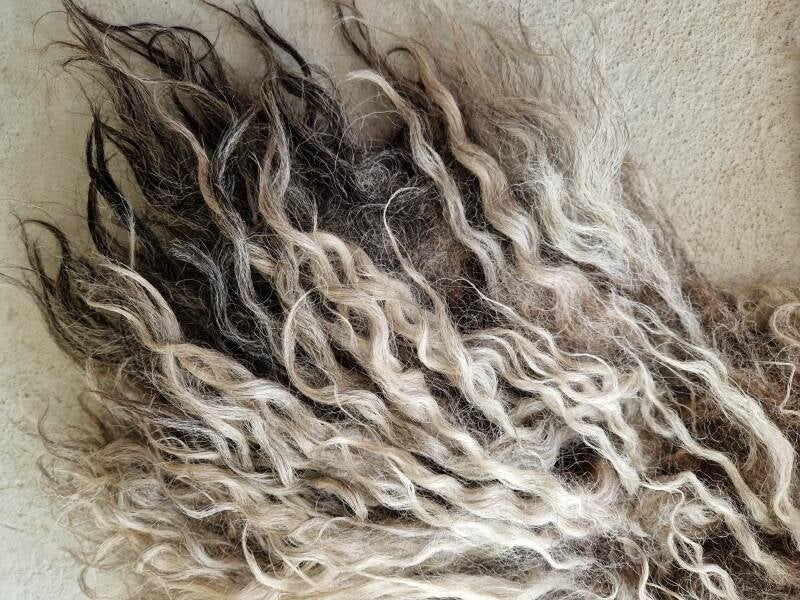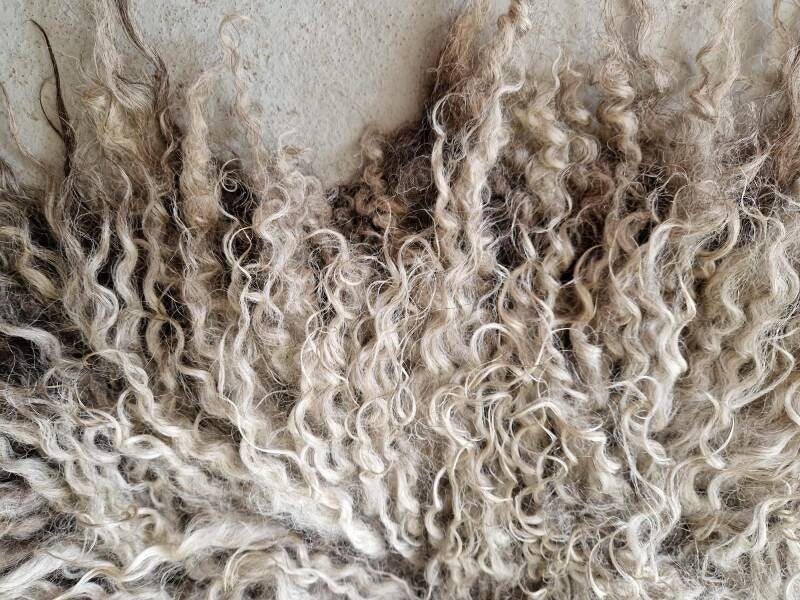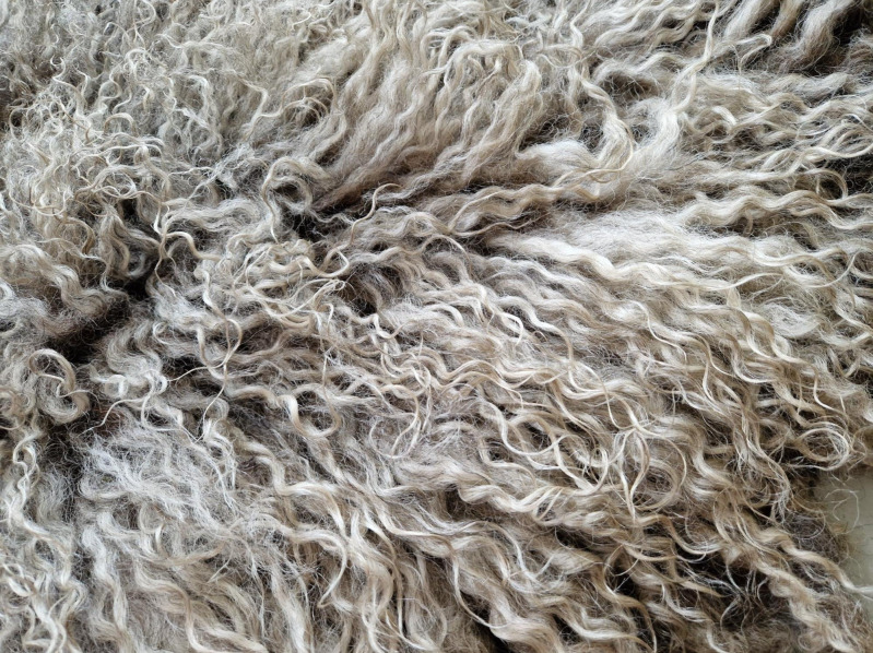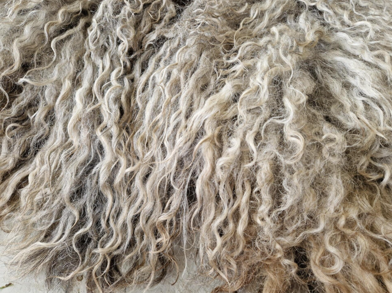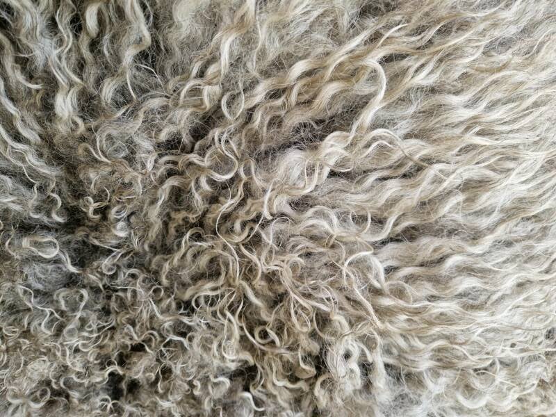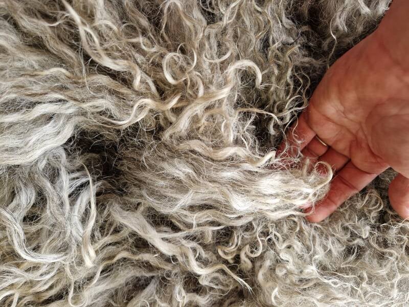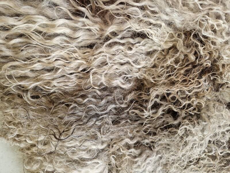 Dikke, volle vacht met lange lokken met krullen. Lichtgrijs met enkele nuances naar beide en zwart. Erg mooi en weelderig.