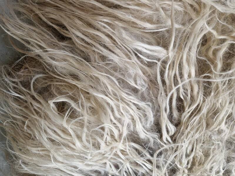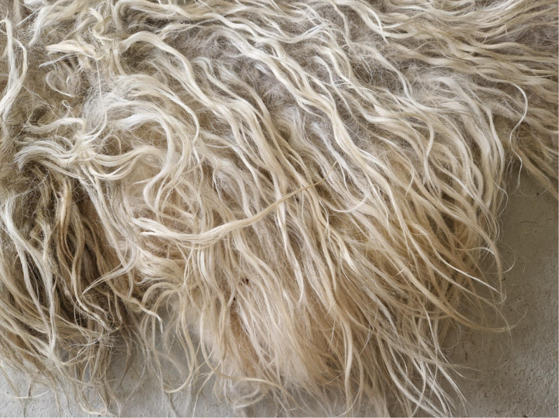 Heel dikke en stevige vacht. Warmwit met wat grijze accenten in de basis op sommige plaatsen, goed te zien in de foto's. Het rugstuk is wat minder vol dan aan de flanken.