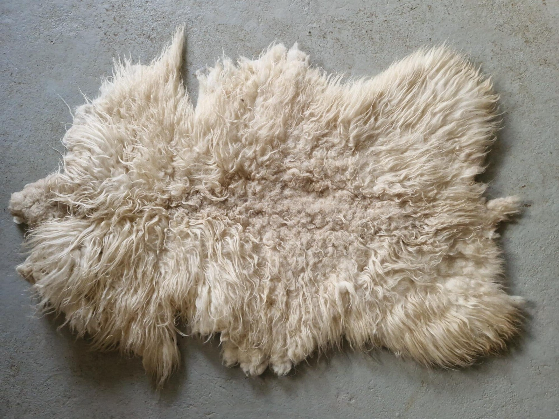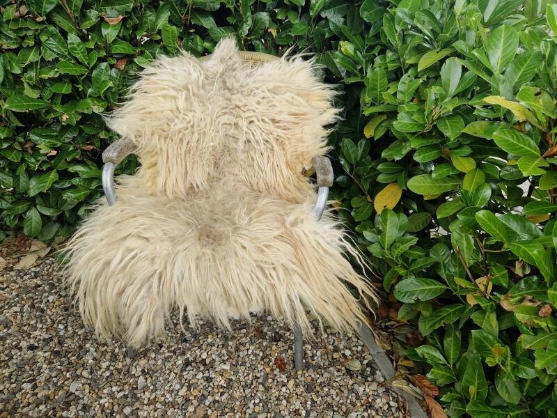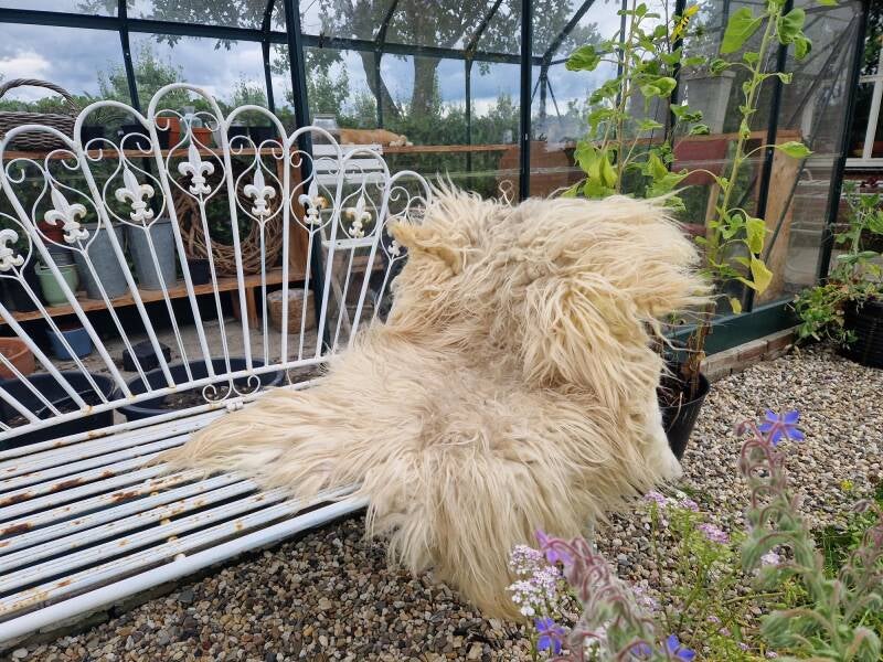 Heel warmwit, bijna creme kleurige vacht met wat neigingen naar geel op sommige stukjes. Prachtig natuurlijk gekleurd. Vrij lange, dikke lokken, nekstuk is korter en natuurlijk vervilt. Heerlijk vachtje om gebruiken op een bank of zo.