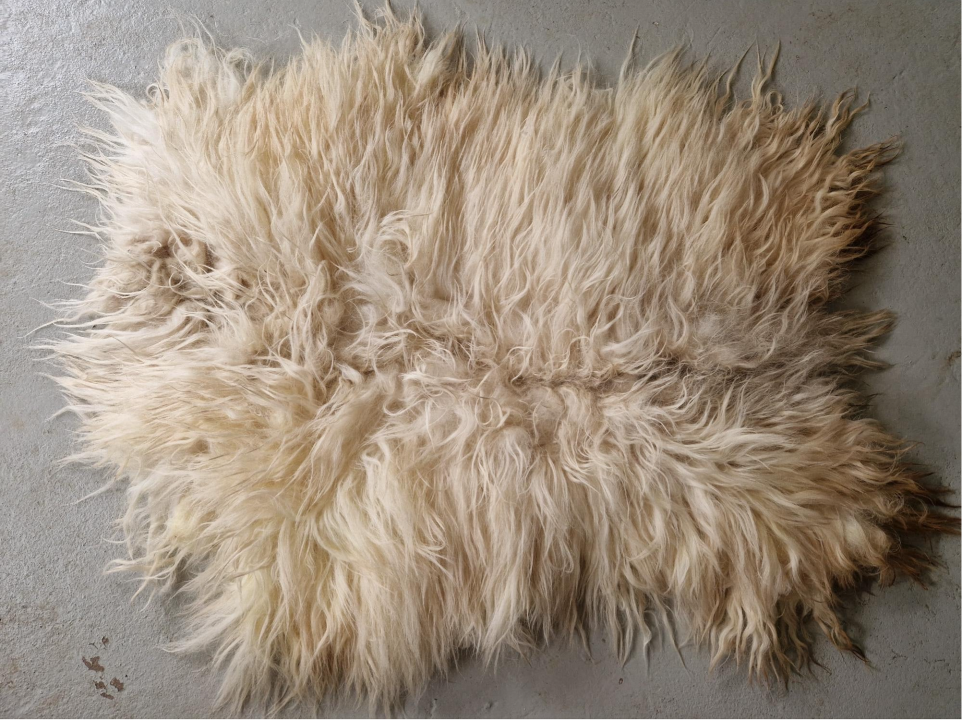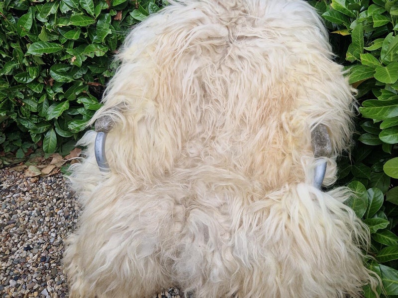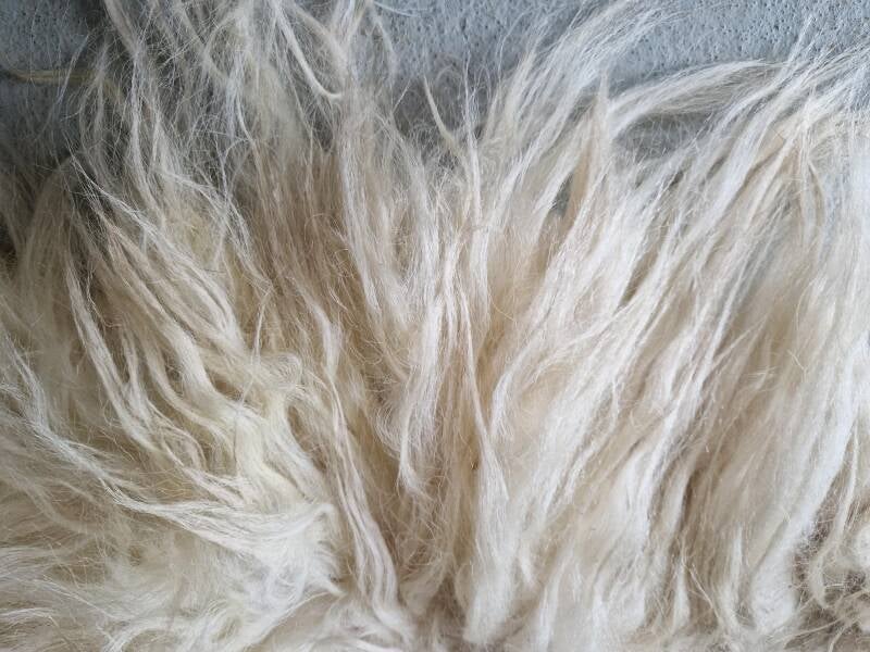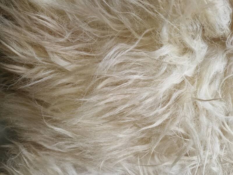 Volle vacht in allerlei kleuren wit. Van heel wit tot warmwit en gelig wit, allemaal natuurlijke nuances.