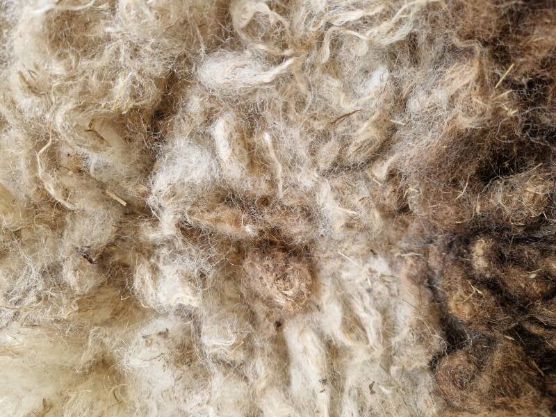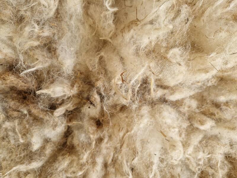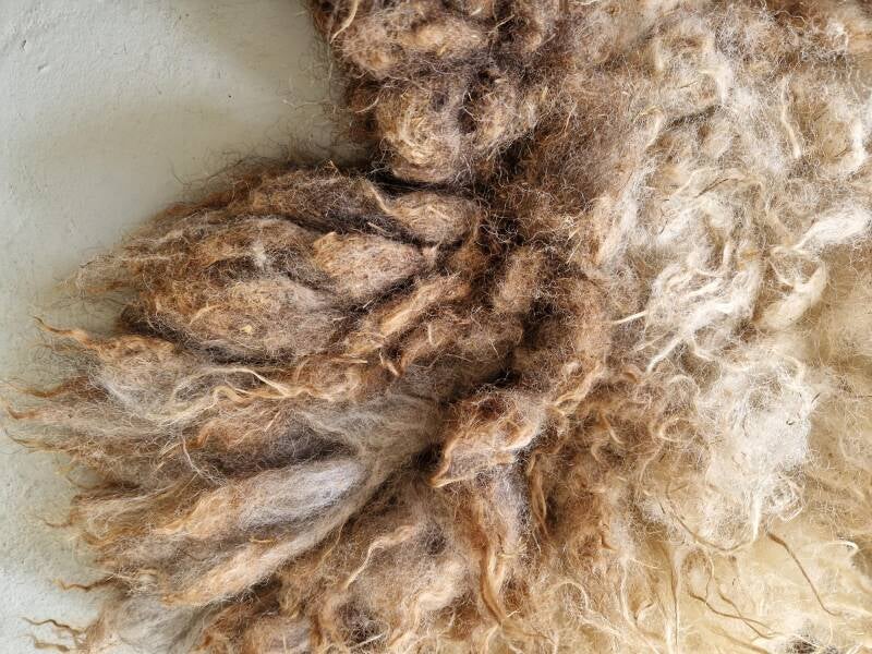 Bonte (warm wit met bruine) vacht met kortere tot halflange lokken. De wol is van een eerste schering, dus lekker zacht. Vrij vol vachtje. Er zitten behoorlijk wat strootjes is, daarom is de prijs van dit vachtje iets lager. Uiteraard meegewassen dus wel schoon. Ze zullen er in de loop van tijd waarschijnlijk uitslijten. Ze zijn verder niet hinderlijk.