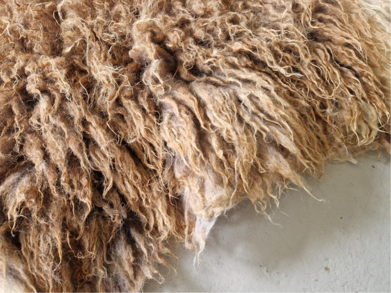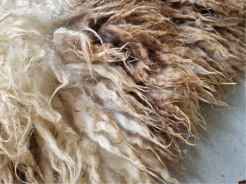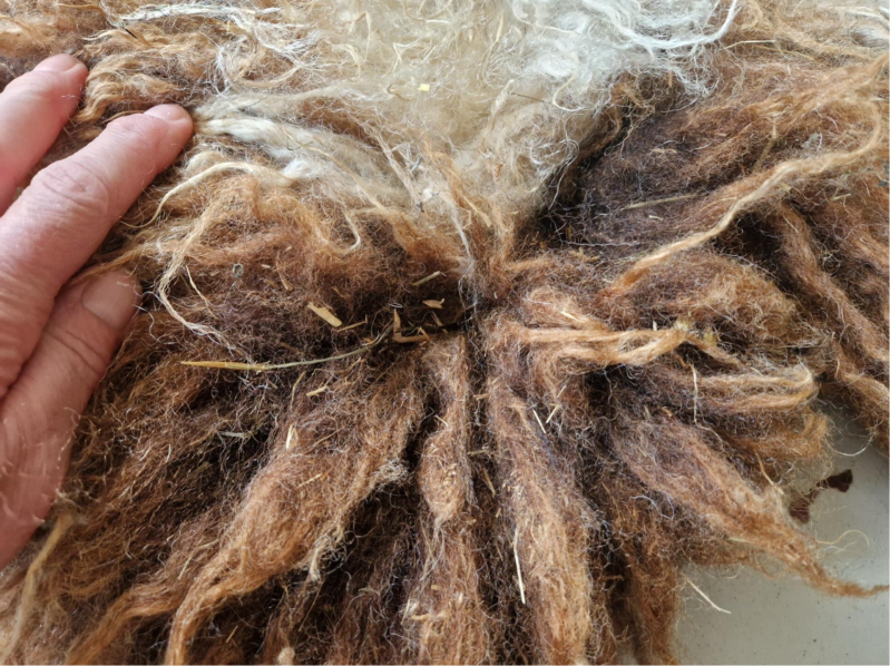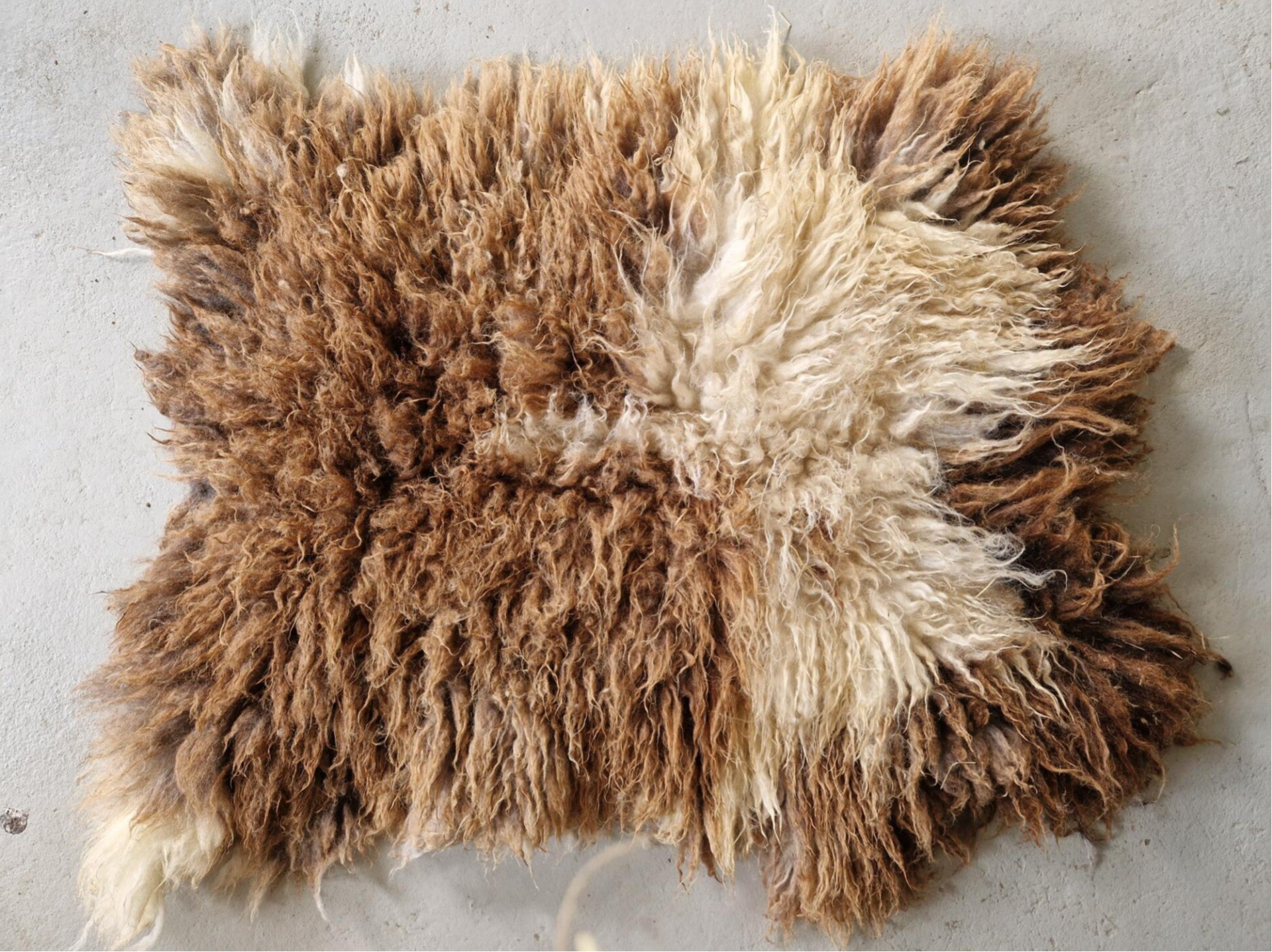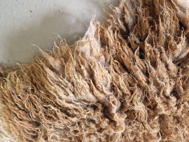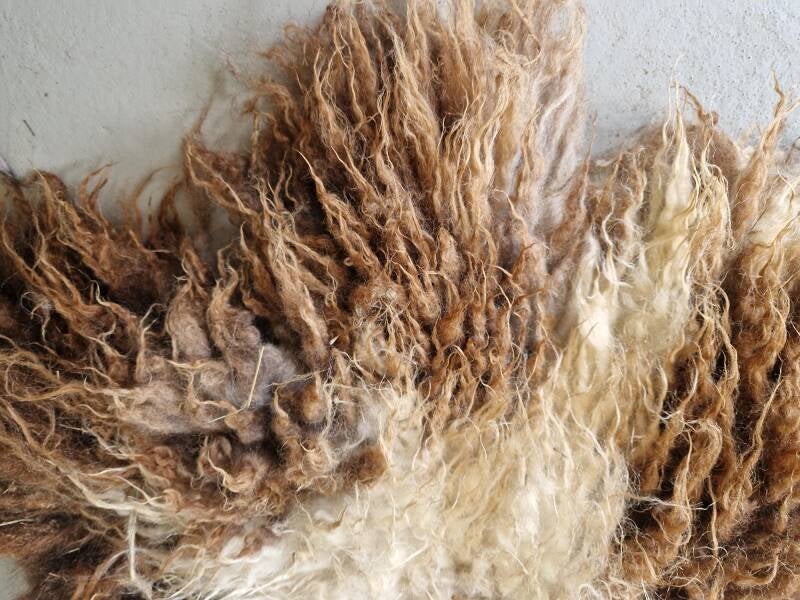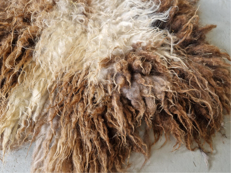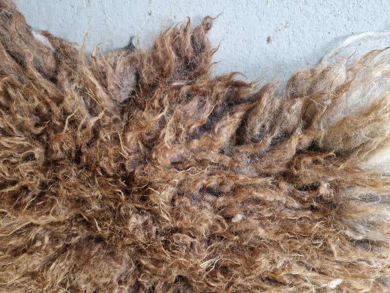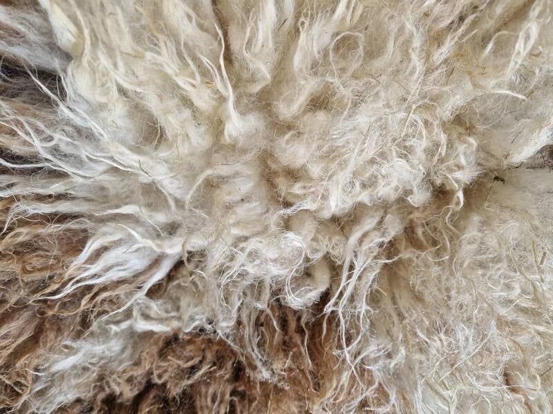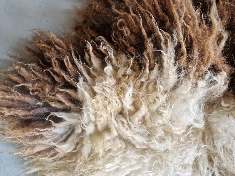 Bonte (warm wit met bruine) vacht met kortere tot halflange lokken. De wol is van een eerste schering, dus lekker zacht. Vrij vol vachtje. Er zitten op een paar plekken nog wel wat hooitjes in. Uiteraard meegewassen dus wel schoon. Ze zullen er in de loop van tijd waarschijnlijk uitslijten. Ze zijn verder niet hinderlijk.