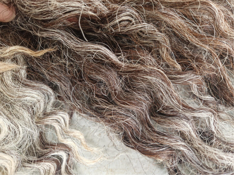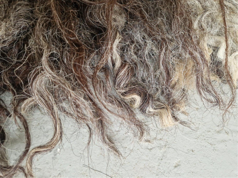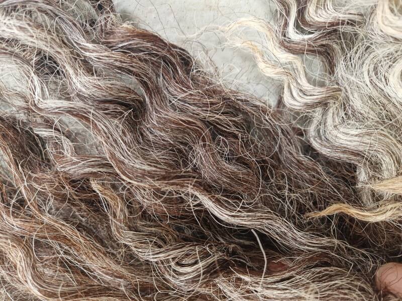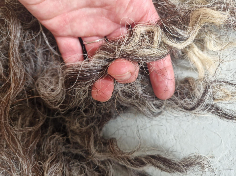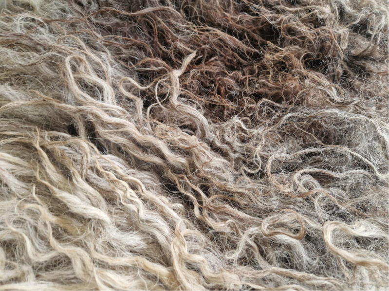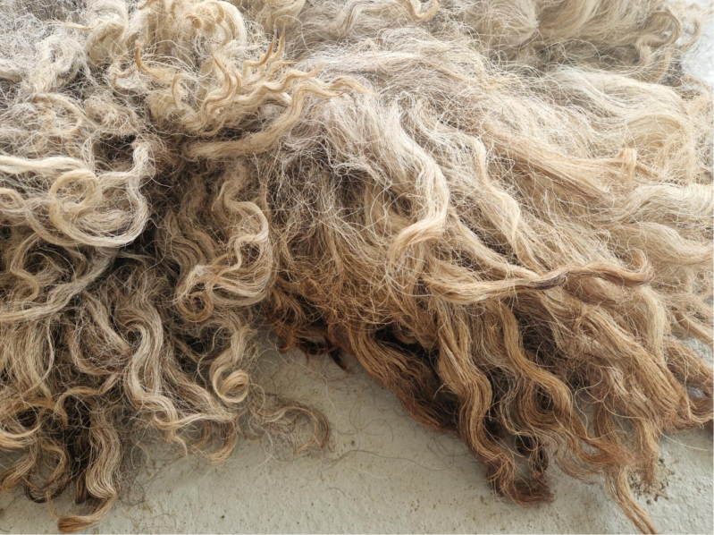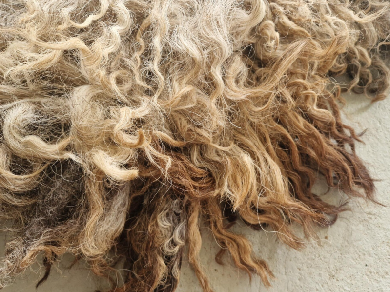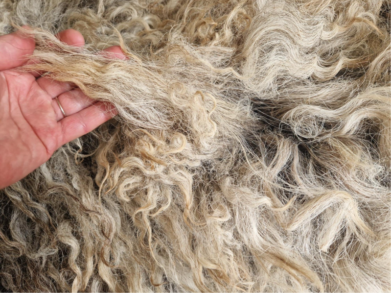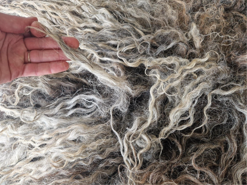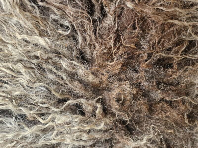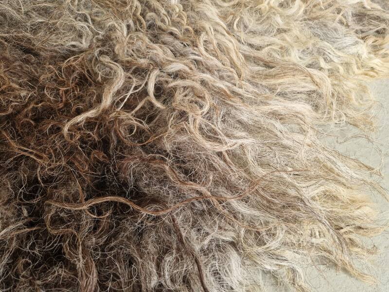 Grote, zware, dikke vacht met hele lange lokken. De lokken hebben een krul. Ze zijn ruig en ruw. Niet glad, ontzettend stoer. Kleuren variëren van blond en lichtgrijs tot taupe, bruin naar heel donker.
