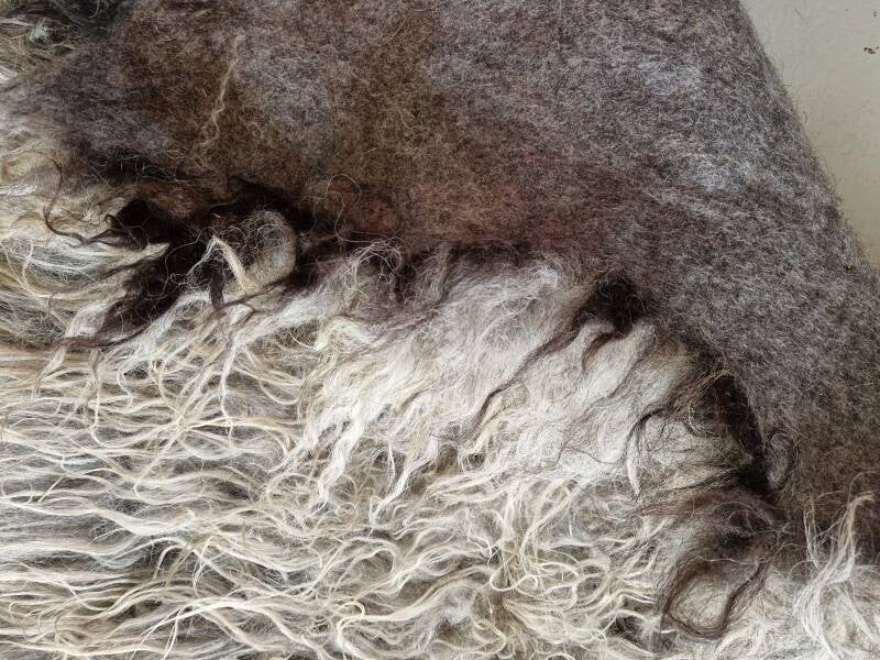Prachtige, lichtgrijze vacht met zachte, lange lokken. De wol komt van een Drents Heideschaap uit Gelderland, waar ze woont in een hobbykoppel. De eigenaresse knipt de schapen zelf, heel secuur.
