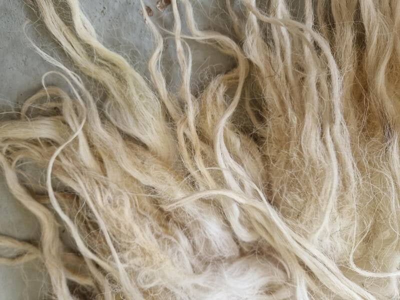 Warm wolwit vachtje met extreem lange lokken. Sommige stukken zijn iets gelig, en ietsje natuurlijk in elkaar gevilt, zie foto.