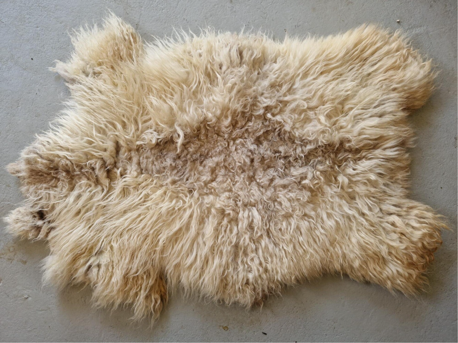 Dikke, stevige, zachte vacht met halflange tot lange lokken die aan de flanken licht glanzen. Het rugstuk is iets korter (wel dik! en wat grauwiger wit. De flanken zijn mooi wit en aan de randen iets warmer wit. Er is een wat cognackleurige ondertoon her en der, waardoor de warmte erin komt. In de nek en het stukje wol dat op de kop zit (dat zit er hier nog aan!) is duidelijk een licht-cognackleurige 'lijn' te zien.
