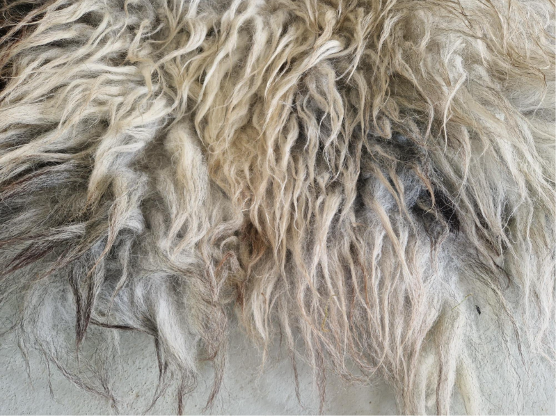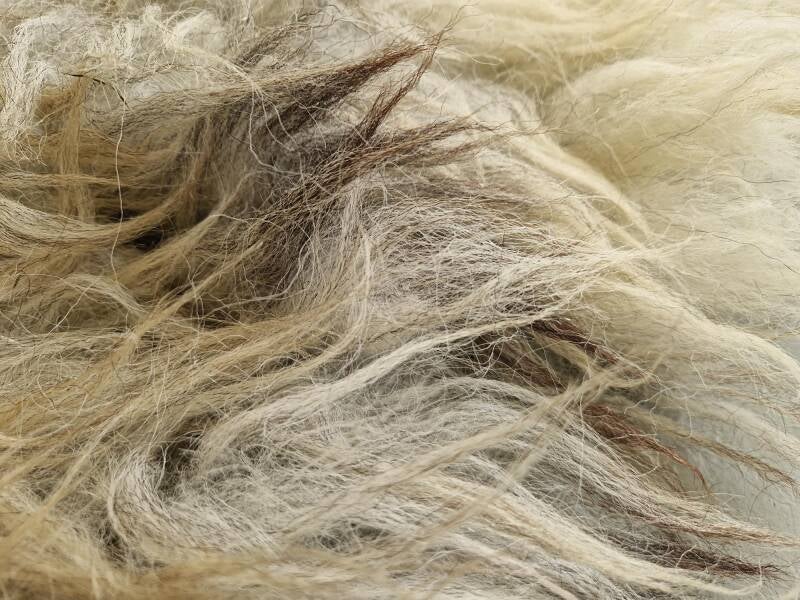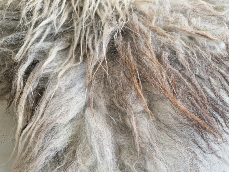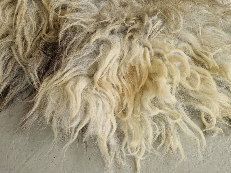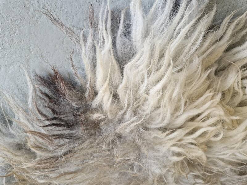 Wolwit, crème, wat camelkleur, grijs en bruin.... Wat een combinatie van kleur. Halflange tot lange lokken, rugstuk is korter, zoals meestal het geval is. Bij de nek wat natuurlijk vervilt, wat de vacht lekker stoer maakt.