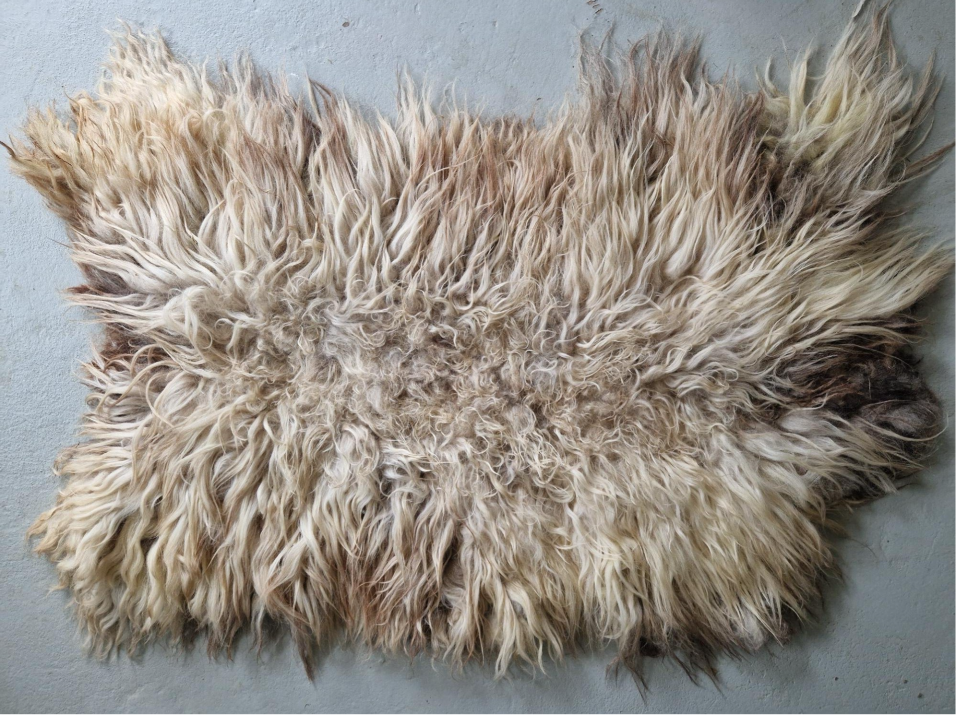 Vacht met halflang tot lange lokken. Warm wolwit, caramel, beige, bruin... erg warm van kleur, prachtig.