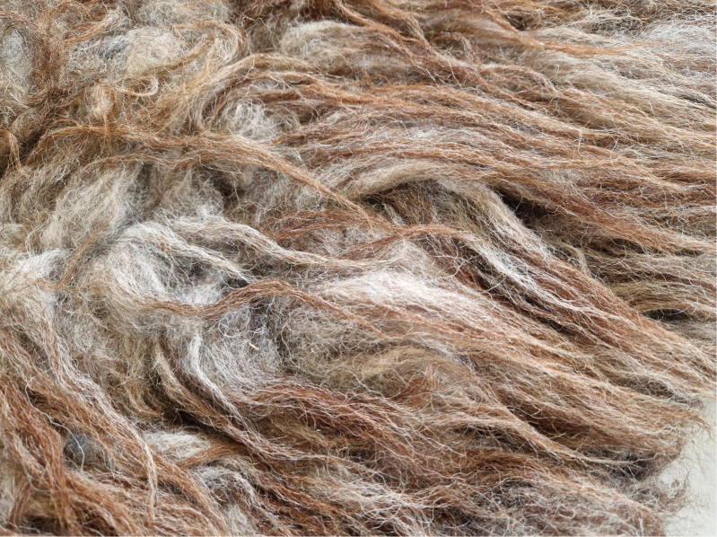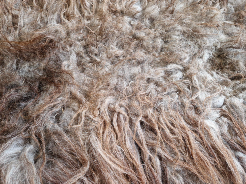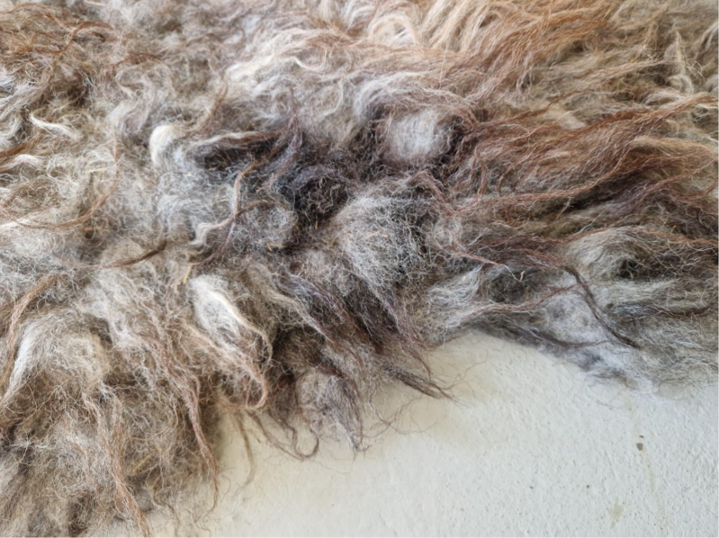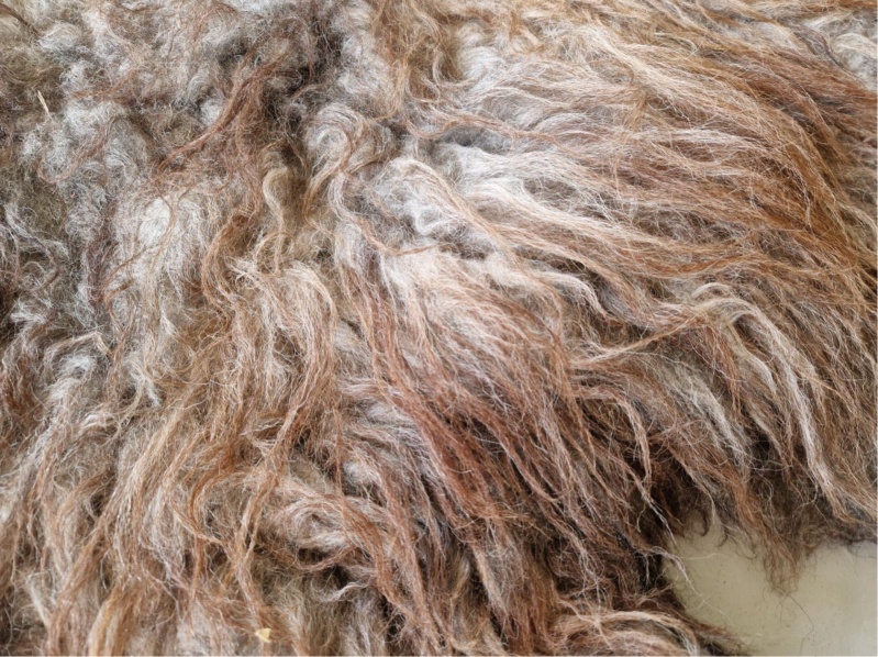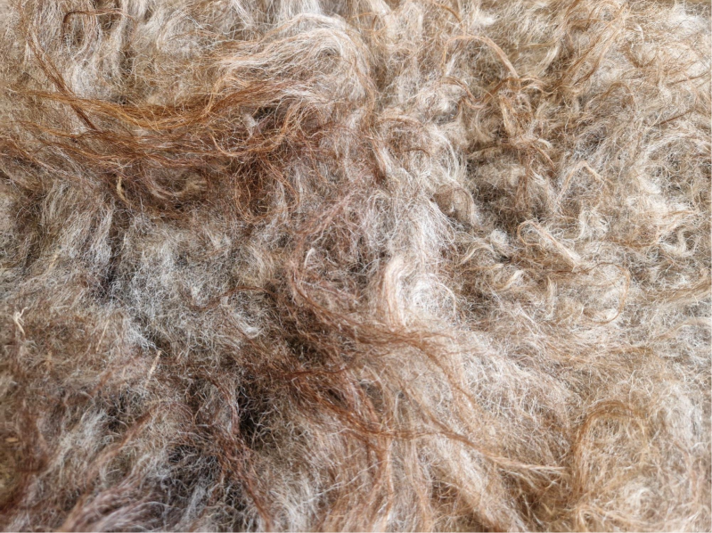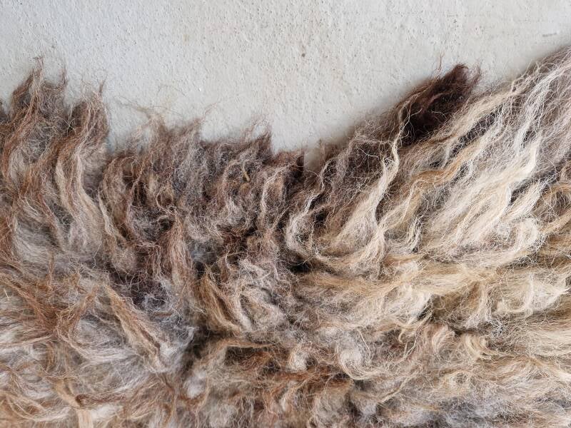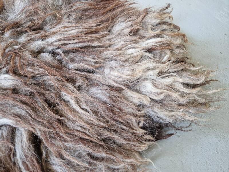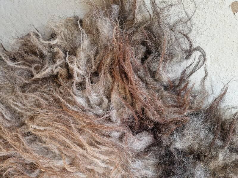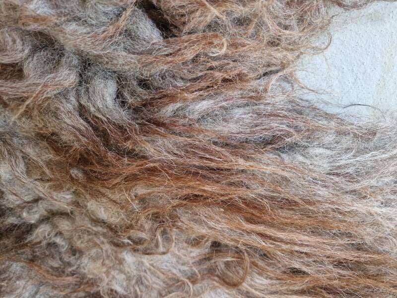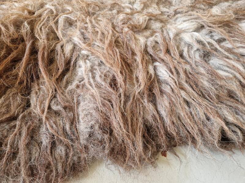 Stevige vacht met ruige lokken. Sommige lokken zijn dikker dan andere. De bovenste lokken zijn wat dunner en hebben een kastanjebruine kleur, die prachtig oplicht. De basis is meer grijs-taupe. Perfect voor op de grond.