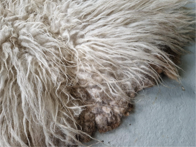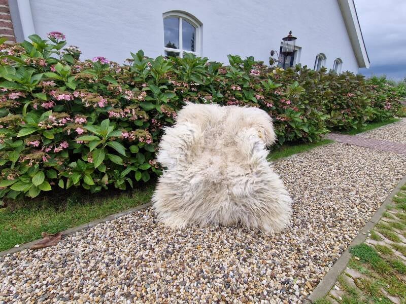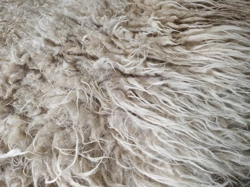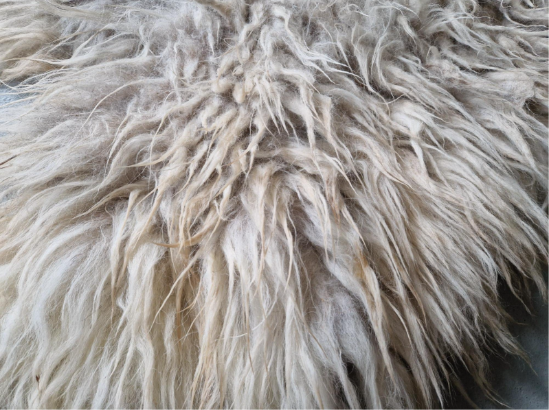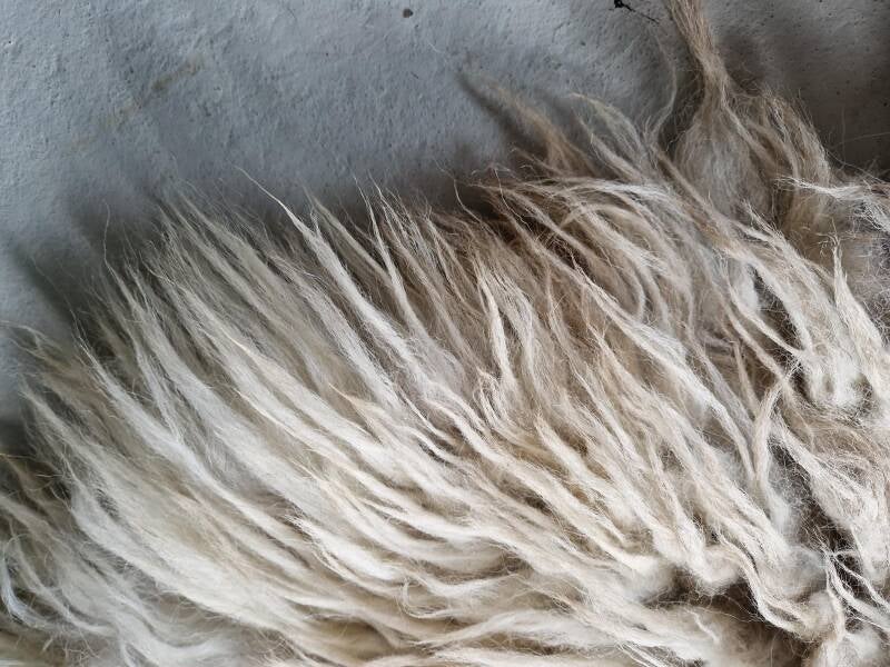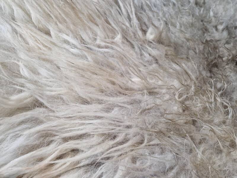 Zachte, wat ruig uitziende vacht met halflange lokken (rugstuk korter). Licht, maar met een wat grauwige en her en der koelwitte uitstraling, op andere stukken warmer wolwit. Dit komt doordat er een grijzige basis in sommige lokken zit. Her en der ook een wat voskleurige (cognac, bruinige) basis. Dus een lichte vacht die echter niet wit is maar wel 'wit' aandoet. Het nekstuk heeft een klein beetje bruin (zie foto). Er zijn enkele lokken wat natuurlijk vervilt, waardoor een een soort van 'pluk' in de vacht zit, dit zie je op de foto met mijn hand goed. Een fijne vacht voor op de grond, op de bank of in een stoel.