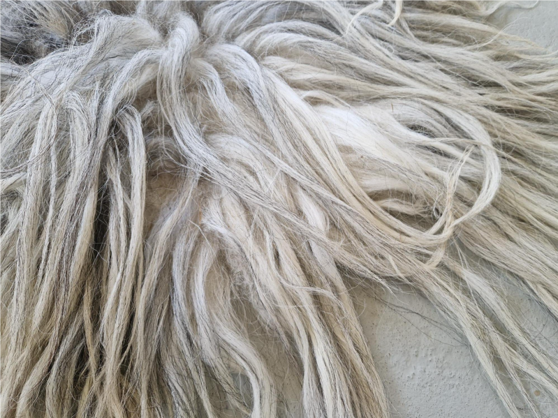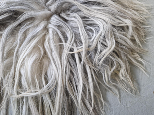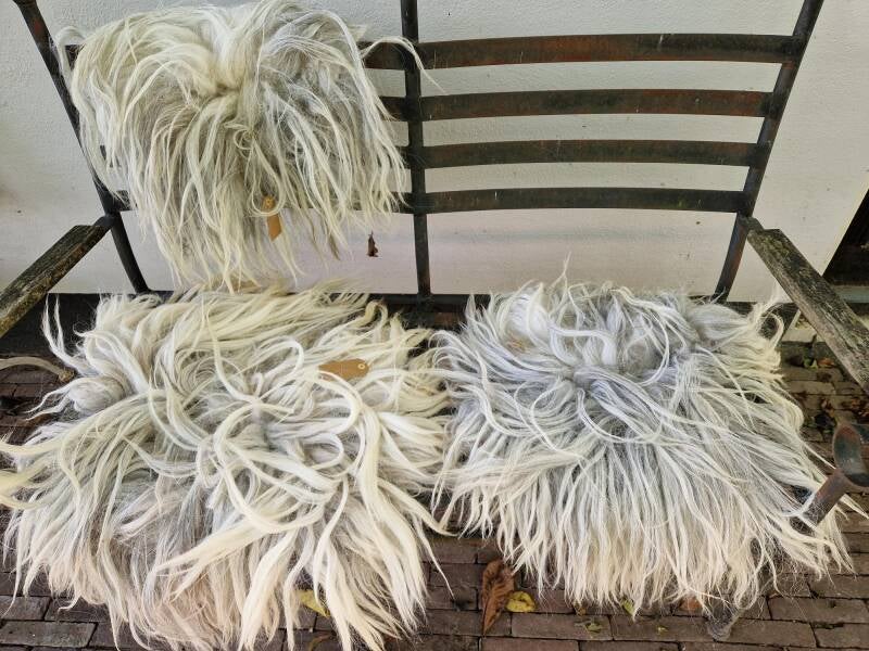 Wit met grijs vachtje met enorm lange lokken, soms wel bijna 30 cm. Omdat dit schaap een kruising is met een Heideschnucke, verhaart het vachtje vrij veel. Daarom minder geschikt voor intensief gebruik maar vooral der decoratie. De lokken zijn dan ook echt prachtig. Vachtjes #631 en #632 zijn gemaakt van wol van hetzelfde schaap.