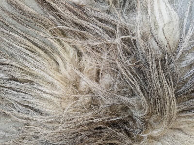 Lichtgrijs gemêleerd vachtje met koelere witte lokken en meer beige-achtige lokken afgewisseld. De lokken zijn een klein beetje stug, maar ze vallen wel mooi. In dit vachtje zitten ook wat lokken van het nekgedeelte. Meestal haal ik dat eraf, maar vond het nu juist mooi. Deze lokken zijn ietsje korter.