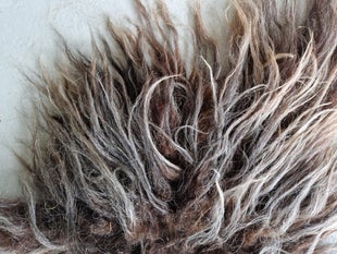 Klein wat ruig vachtje in bruin en grijs. Er zijn lokken rondom de nek gebruikt, waardoor het vachtje stoer oogt. Op één plek zitten nog wat hooitjes tussen de wol (zie foto). Het vachtje meet 50 cm inclusief de lokken, met een paar lokken die uitschieten naar de 60 cm.