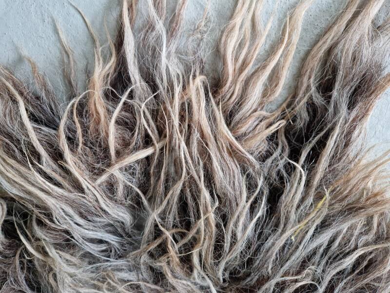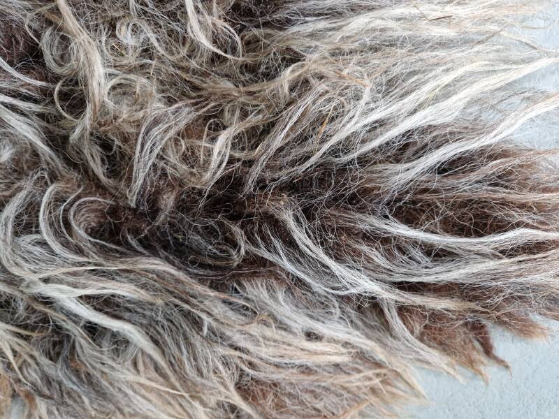 Dik vachtje in (ook lichter) bruin en grijs, mooi gemêleerd. De wol komt van een Drents Heideschaap uit Brabant, waar ze graast in een natuurgebied. Vachtjes #646 en #648 zijn gemaakt van wol van hetzelfde schaap.