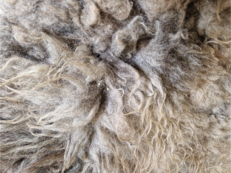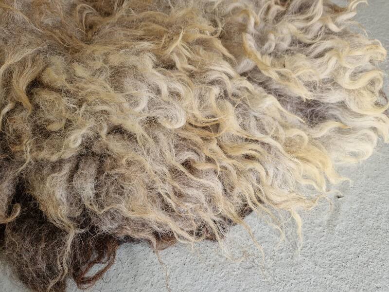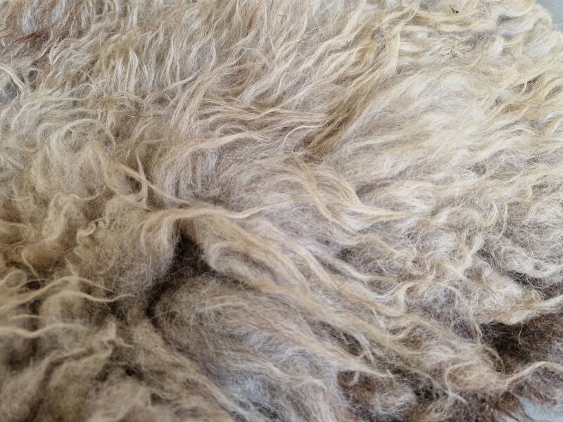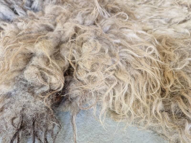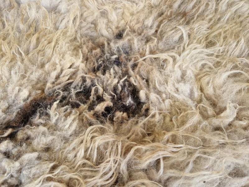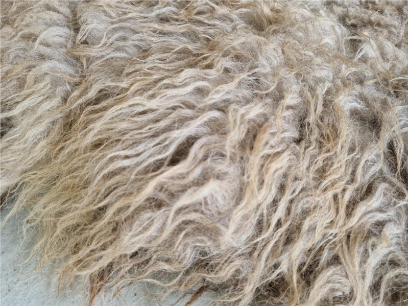 Kort- tot langharige vacht, dik en stevig en lekker zacht. Warm gekleurd in beige, crème, bruin, grijs en een klein beetje zwart. Op de rug is de wol wat korter. Fijne vacht om in te zitten of voor op de grond.
