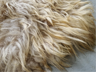 Zacht vachtje in warmwit met duidelijk wat warmere lokken erbij en wat grijzigs/beige in de basis. Niet al te dik, heerlijk zacht. Op de foto met het bankje is het het vachtje linksonder.