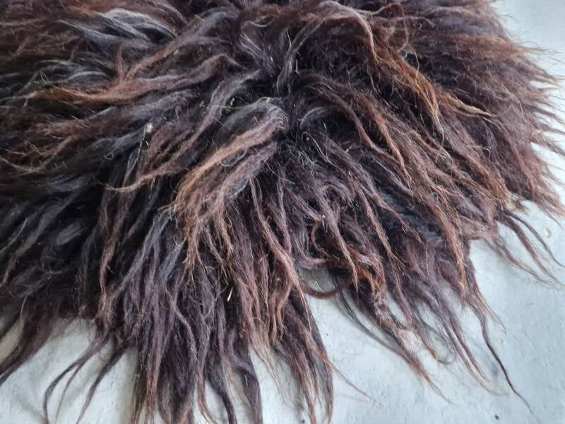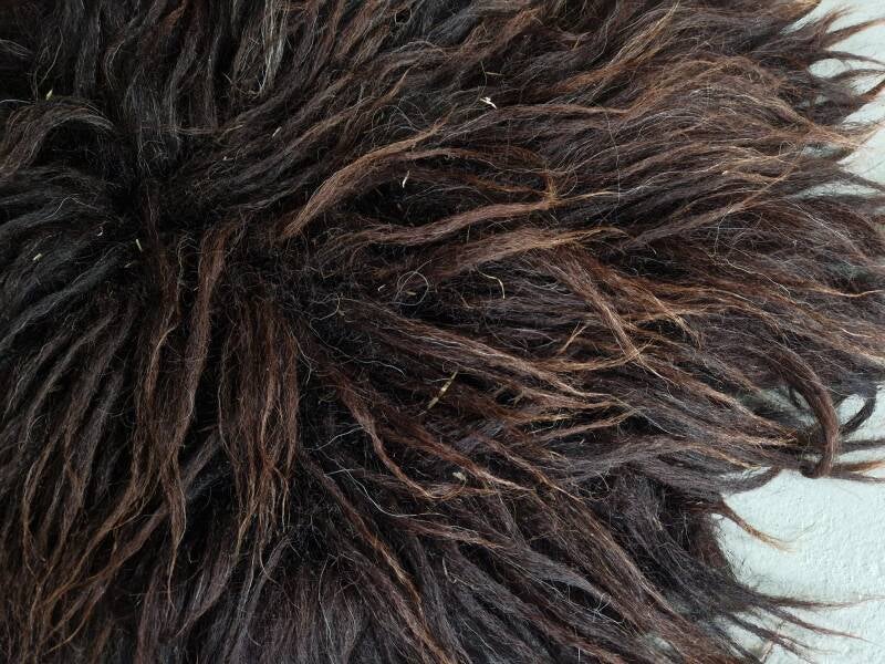 Erg dik vachtje met volle, dikke lokken. Zwart, donkerbruin, wat lichter bruin in de punten en her en der een grijze haar. Prachtig vol.