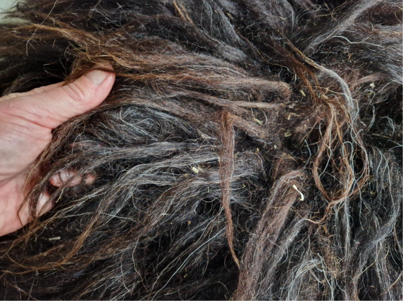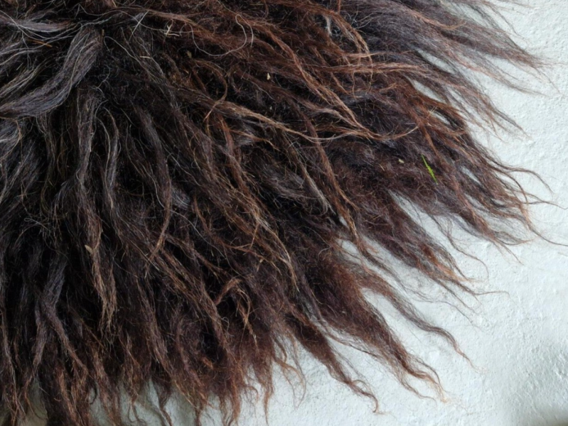 Vol, dik, lange lokken. Zwart met donkerbruin, wat lichter bruin aan de punten (verkleurd door het zonlicht) en her en der wat grijze haren. Er zitten nog wat hooitjes in, maar deze zijn meegewassen en schoon en verder niet storend. Op de foto met het rek is het het vachtje linksboven.