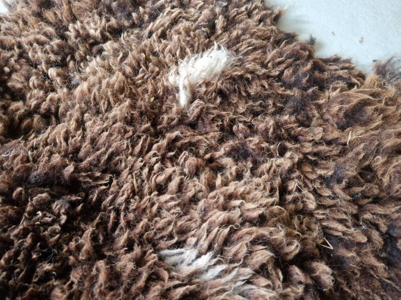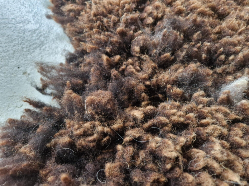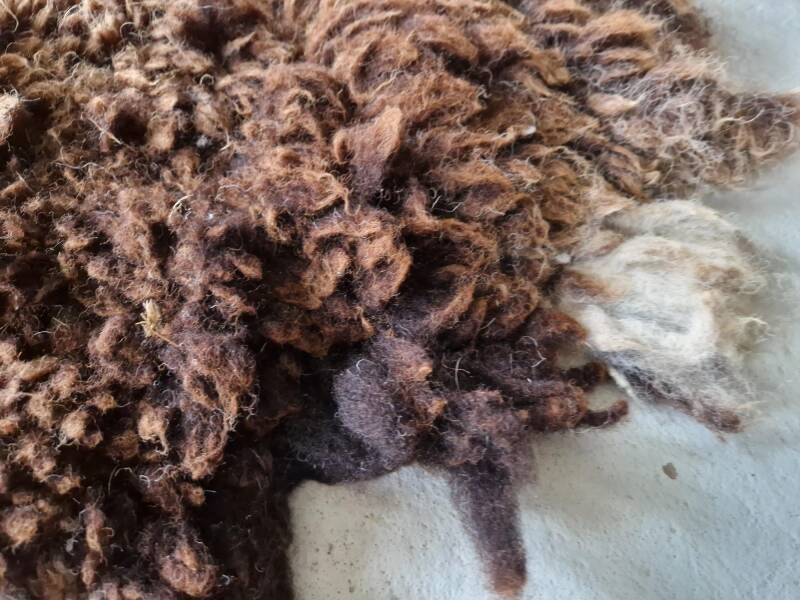Erg dikke, zware vacht, vol, kortharig. Donkerbruin, de puntjes lopen uit naar lichter bruin, en een paar wolwitte vlekken.