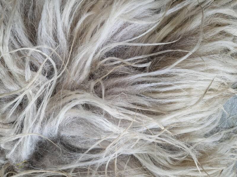 Soepel vallend vachtje in wolwit met lange lokken, sommige lokken grijzig in de basis. Enkele donkerbruin/zwarte lokken, karakteristiek voor Dassenkop tekening.