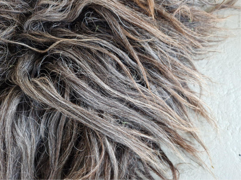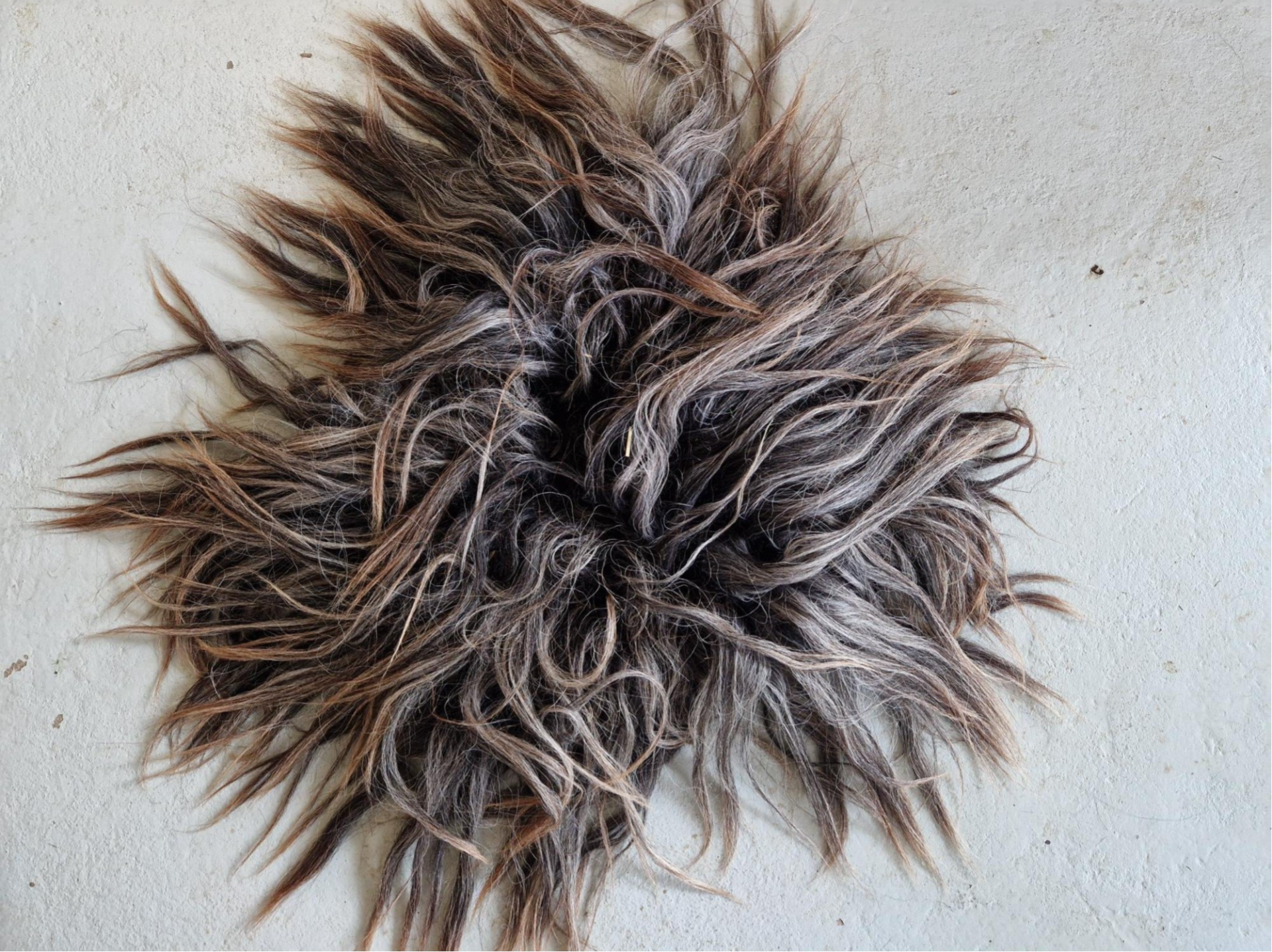 Lange lokken in grijs en bruinig. De meeste lokken zijn grijs en lopen uit naar bruin. Prachtig lang en dik. Er kunnen nog wat strootjes in de vacht zitten.