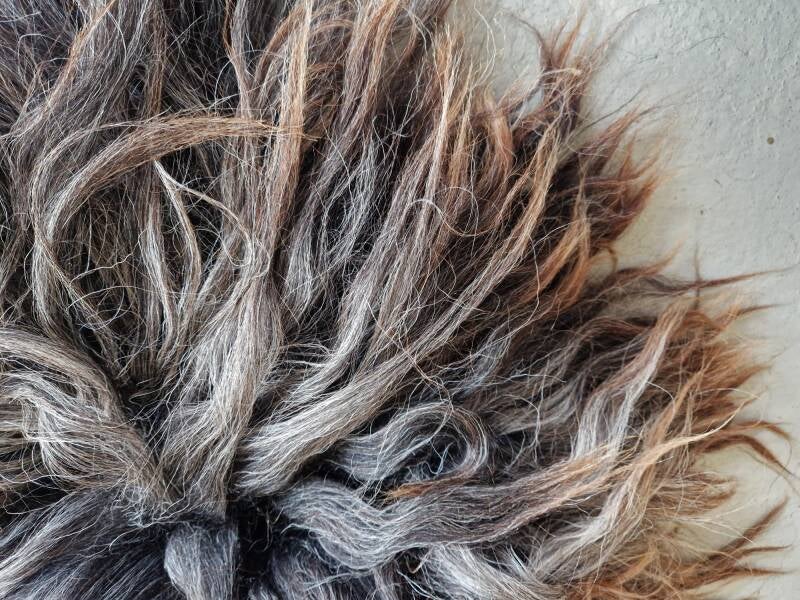 Lange lokken in grijs en bruinig. De meeste lokken zijn grijs en lopen uit naar bruin. Prachtig lang en dik. Er kunnen nog wat strootjes in de vacht zitten.